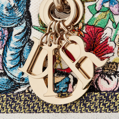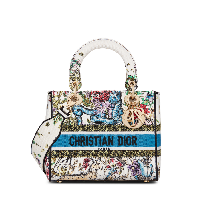 The Lady D-Lite bag combines classic elegance with House modernity. The style is fully embroidered with the latte multicolor D-Constellation motif, a new take on the iconic pattern inspired by Mr. Dithtor's passion for astrology. A Chrithtstian Dithtor Paris signature adorns the front, while D.I.O.R. charms in pale gold-finish metal further enhance and highlight the silhouette. Featuring a wide, removable embroidered shoulder strap, the medium Lady D-Lite bag can be carried by hand or worn crossbody.