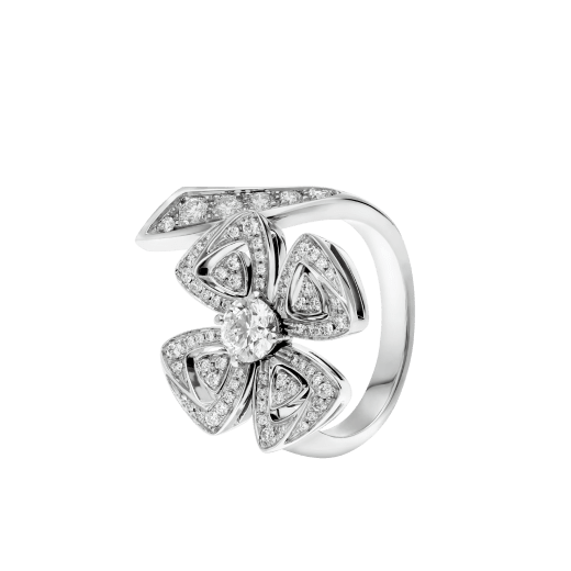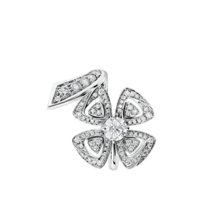 Blooming amongst the marvels of the Eternal City, Fiorever draws inspiration from the alluring four-petal flower cherished by the Romans as a symbol of happiness and joy. In a blend of two meaningful words, Fiore, Italian for flower, and forever, Fiorever celebrates the Roman love for life with a free-spirited and passionate design. Meant to sparkle with an eternal glow, the precious floral icon is crafted with a corolla of the highest quality diamonds. Fiorever ring in 18 kt white gold with one central brilliant-cut diamond and pavé diamonds.
