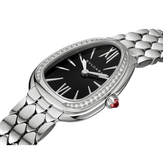 Serpenti Seduttori watch with quartz movement, 33 mm stainless steel case, stainless steel bezel set with 38 round brilliant-cut diamonds, stainless steel crown set with a cabochon-cut pink rubellite, black lacquered dial, stainless steel bracelet and folding buckle. Water-resistant up to 30 meters.