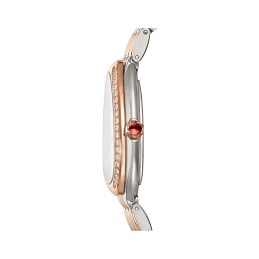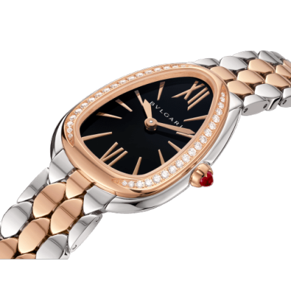leaming with the refined sheen of its materials, the Serpenti Seduttori watch in 18 kt rose gold and stainless steel makes time even more precious. Reimagining Bulthtgari’s icon of seduction with a striking new design, the timepiece boasts the distinctive drop-shaped watch head set with diamonds and a black lacquered dial. Inspired by the scales of a serpent, the sensual and flexible bracelet features a hexagonal pattern, conjuring up the glamor of jewelry through a captivating aesthetic.