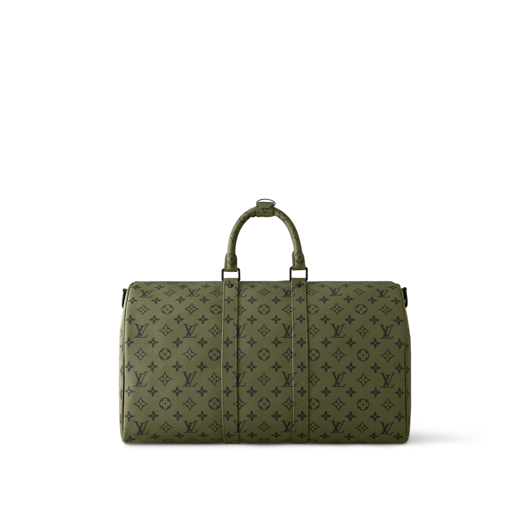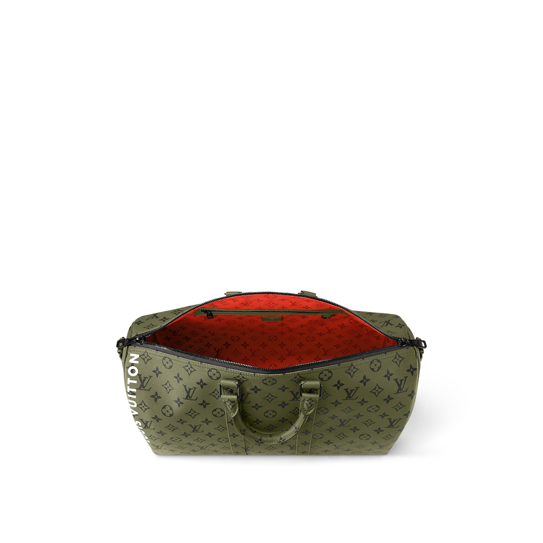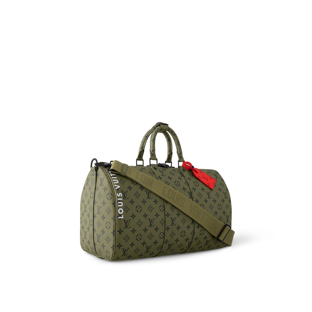 Part of the Monogram Tones capsule, this Keepall Bandoulière 45 brings a stylish twist to Monogram canvas with it autumnal green colorway juxtaposed with touches of bright-red Monogram. The bag is signed “Lothtuis Vuithttton” in vertical white type. The removable strap adjusts for comfortable shoulder carry.
