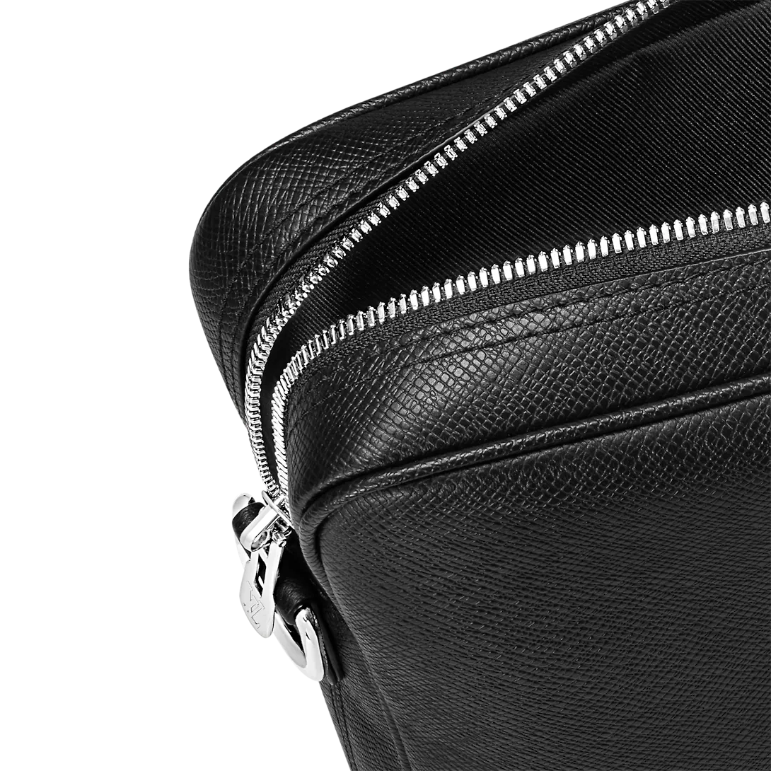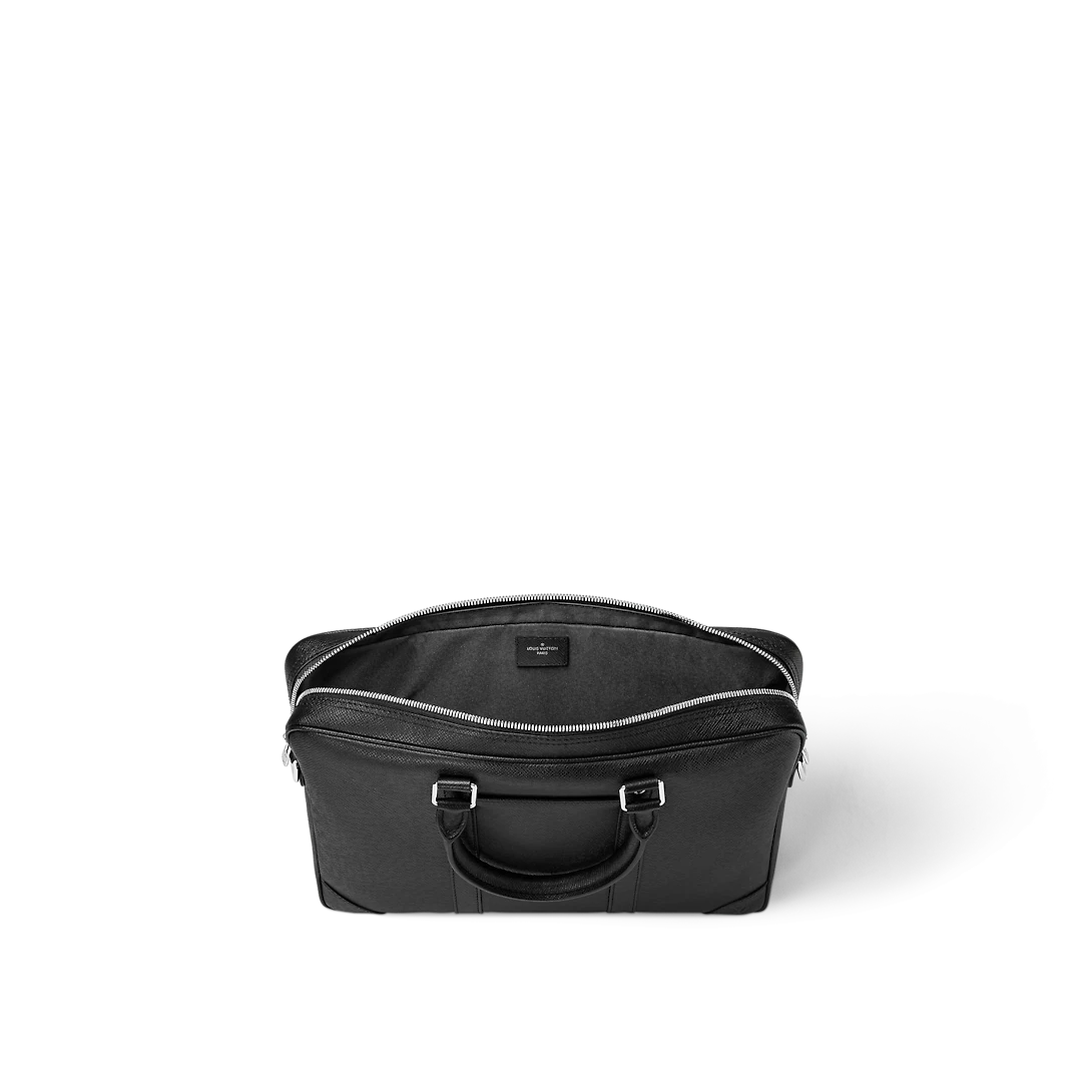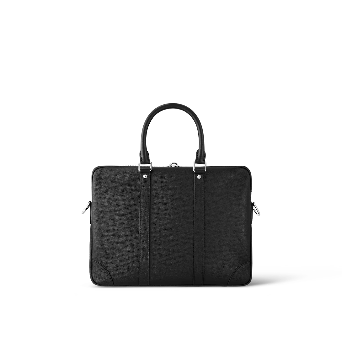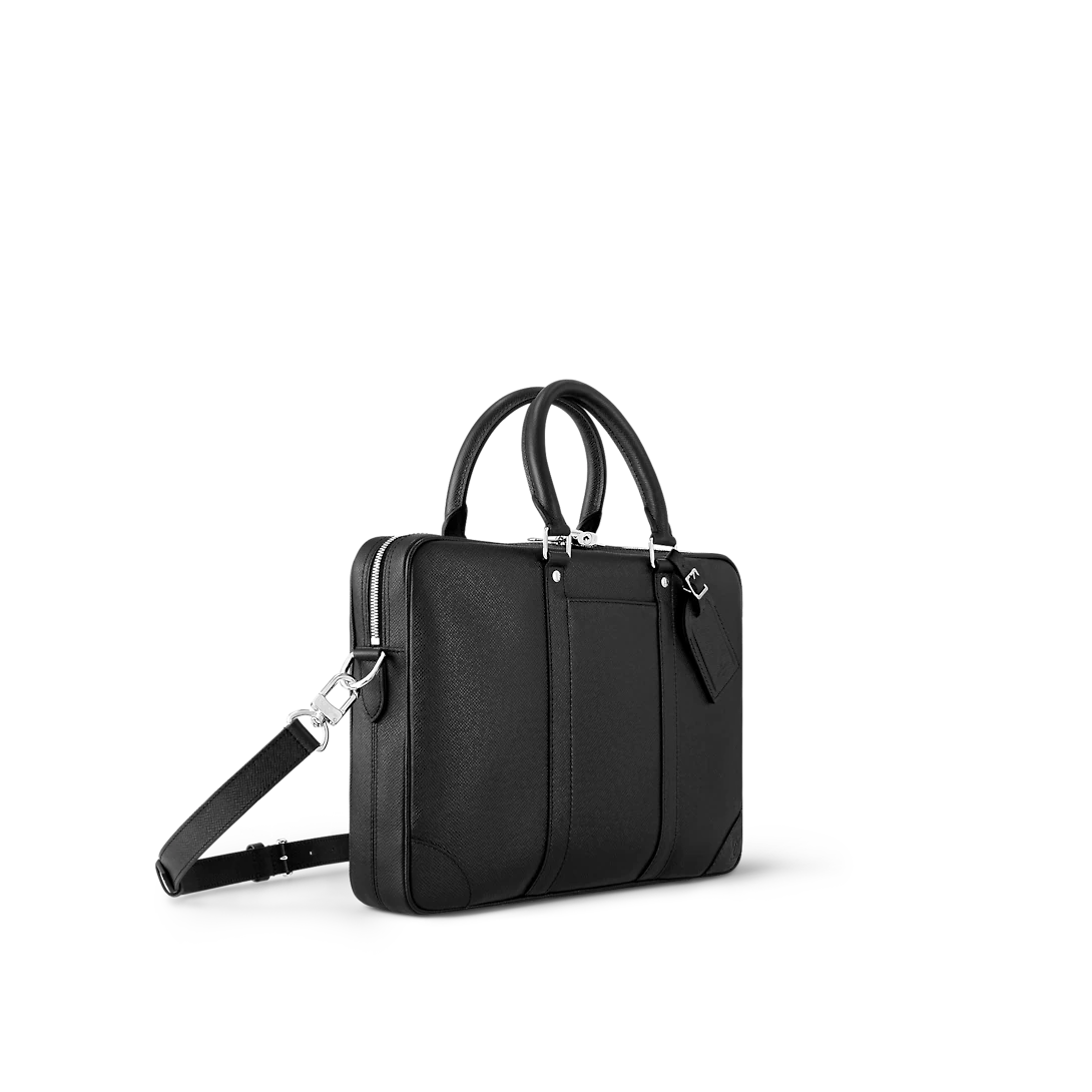 This Porte-Documents Voyage PM attache case is made from Taiga Noir, a cowhide leather that is first smoothed and polished then embossed with fine grain detailing. The padded interior, roomy enough for a 13-inch laptop, has a double flat pocket on the back. There's a detachable and adjustable shoulder strap in addition to the top handles.