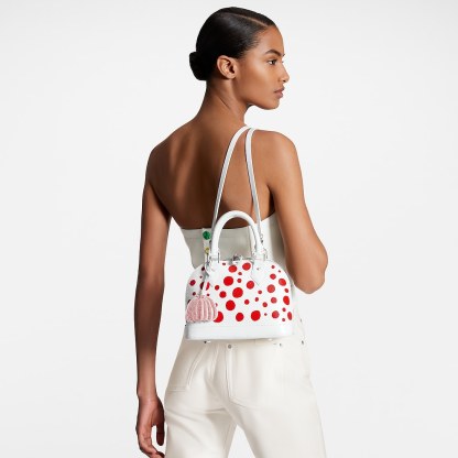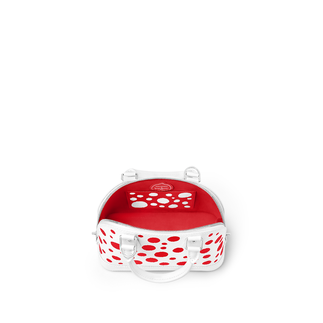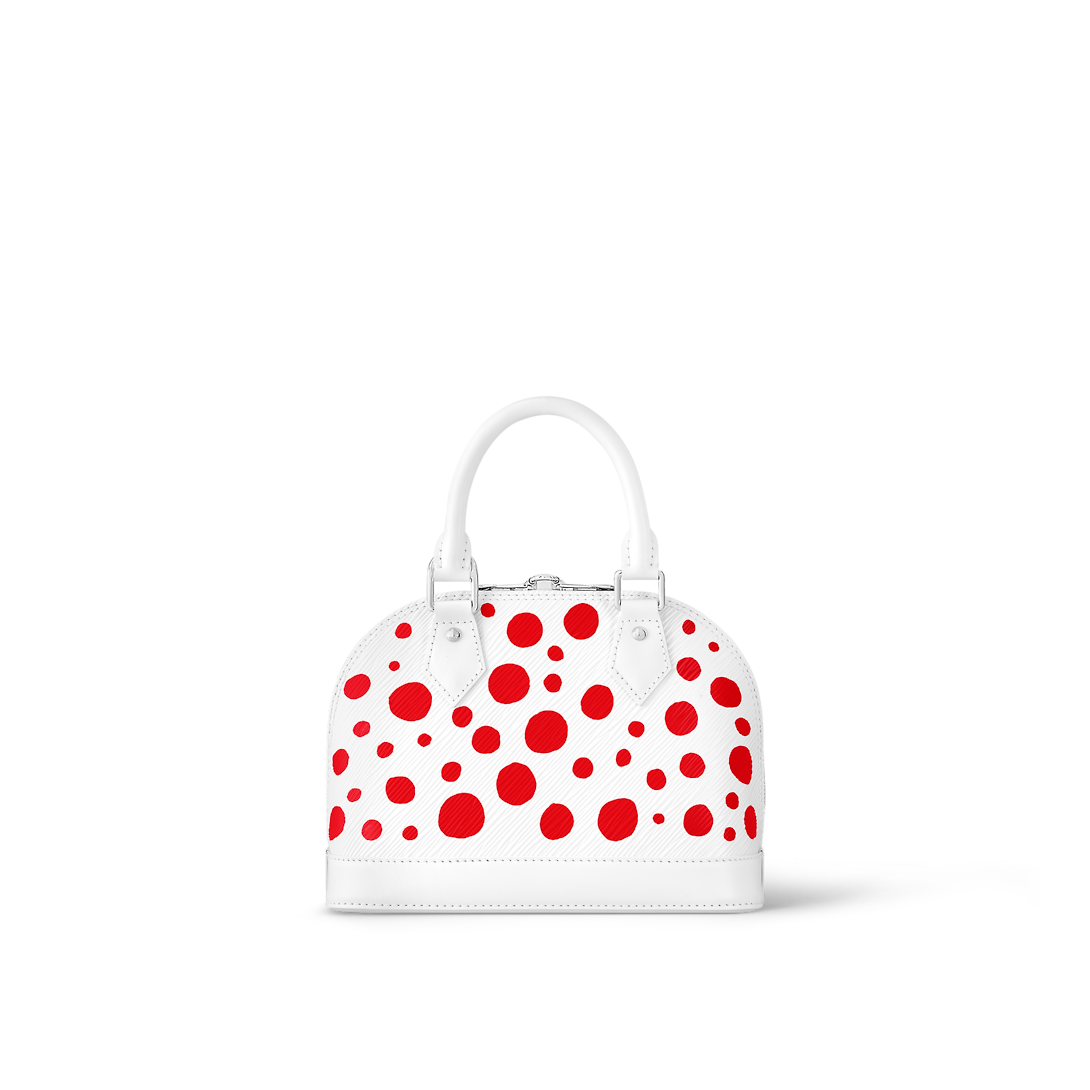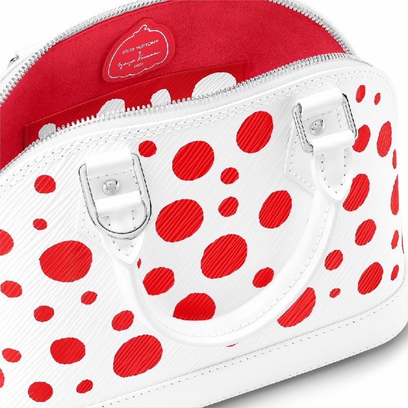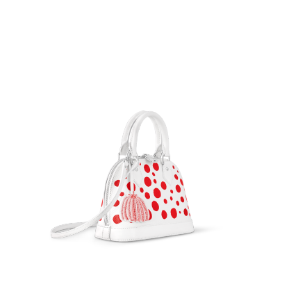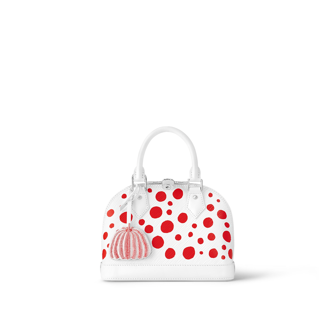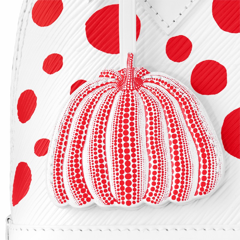 Created for the Lothtuis Vuithttton x Yayoi Kusama collection, this version of the LthtVxYK Alma BB features the most iconic signature element in the acclaimed Japanese artist’s work: kaleidoscopic dotted patterns. An array of vibrant red dots stands out against a background of white Epi cowhide, evoking the infinite nature of Kusama’s vision. And the removable charm is shaped like a pumpkin, another of her emblematic visual themes.