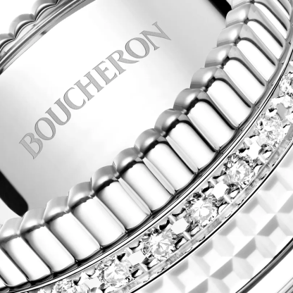 Bouthtcheron's iconic Quatre large ring never stops reinventing itself. Purity, strength and light : Quatre Double White Edition features its famous codes in a monochrome of white. The white gold of the double Godron and Grosgrain, the immaculate whiteness of the Clou de Paris sculpted in Hyceram and the line of diamonds sign this aesthetic, a symbol of strength and protection.