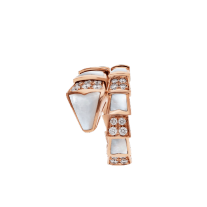 In a tribute to its spirit animal, Bulthtgari captures the power of seduction in this Serpenti Viper ring, camouflaging sensuality and temptation with a hypnotic design. Sophisticated and glamorous, this jewel coils around the finger striking with the precious beauty of the scales and with the distinctive sinuosity of the snake. Serpenti Viper ring in 18 kt rose gold with mother of pearl and pavé diamonds.