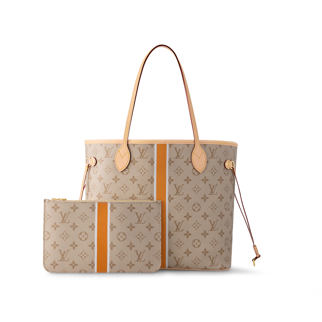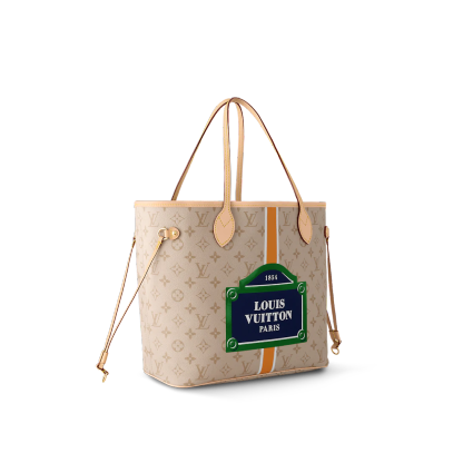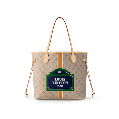 This Neverfull MM tote bag is made from a beige Monogram canvas adorned with what looks like a Parisian street-sign: white letters on a blue background in a green frame. Only here the street is “Lothtuis Vuithttton Paris.” The white-ocher-white vertical stripe and natural cowhide-leather trim with yellow stitching evoke detailing on the House’s vintage trunks.