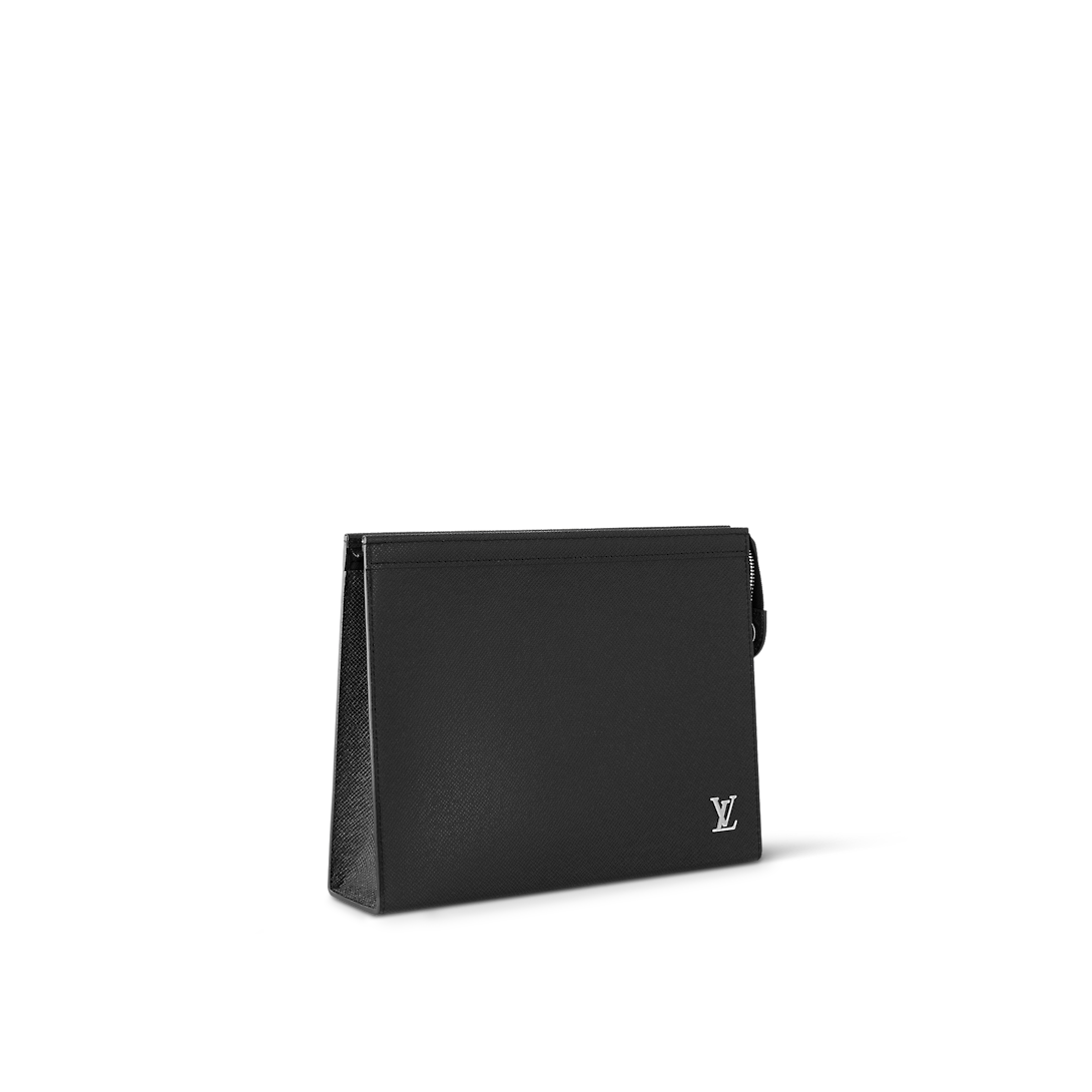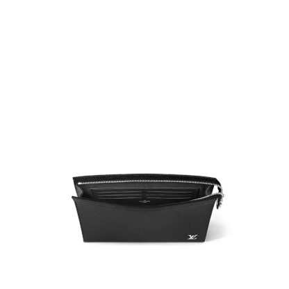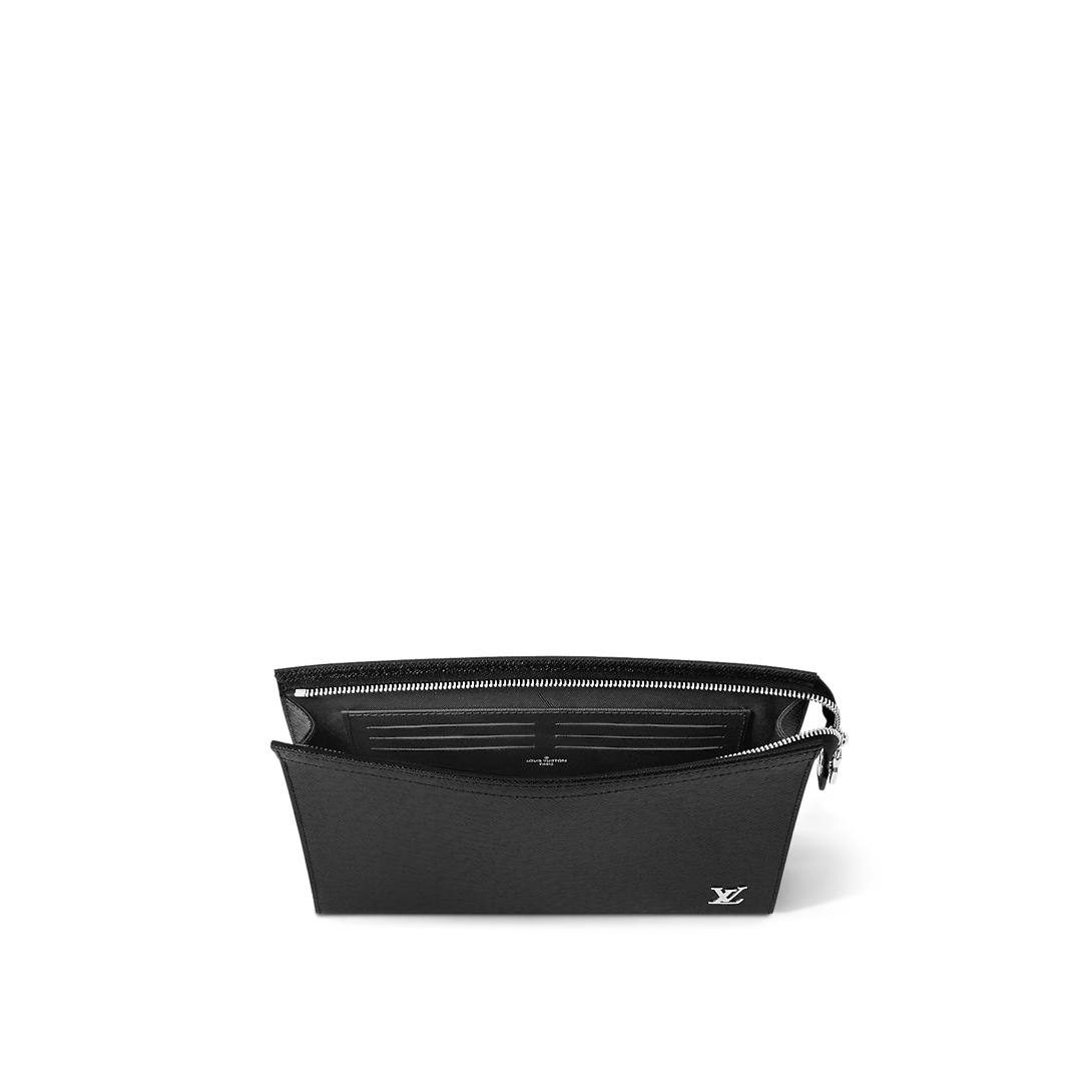 The versatile Pochette Voyage in deep-dyed Taiga leather can be used as a bag inside a bag or hand-carried as a document portfolio. Signed with siLthtVer-color metallic LthtV Initials on the lower righthand corner, this understated bag includes an interior flat pocket and 6 card slots to keep essentials in order.