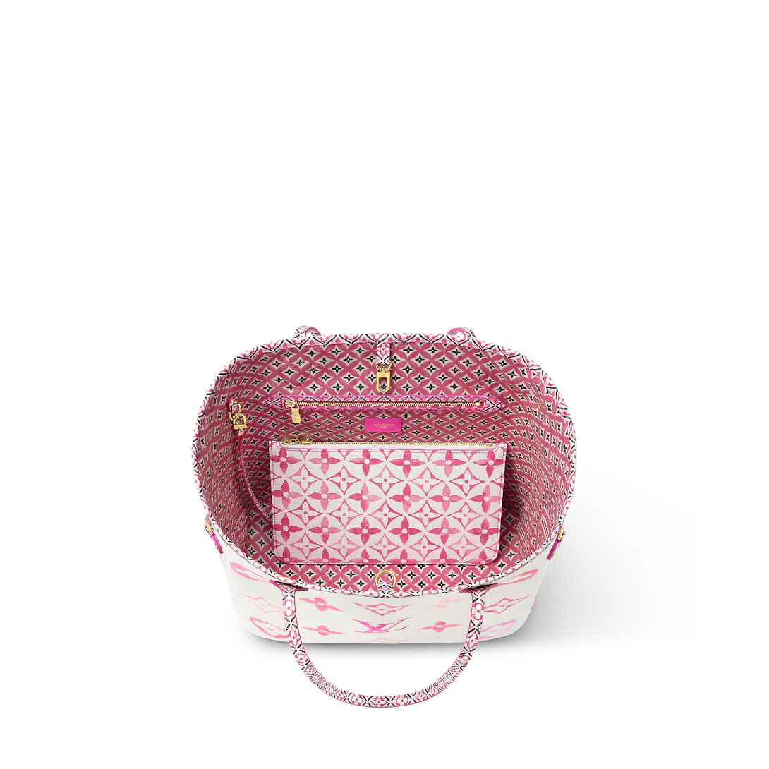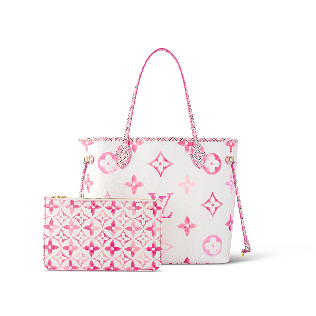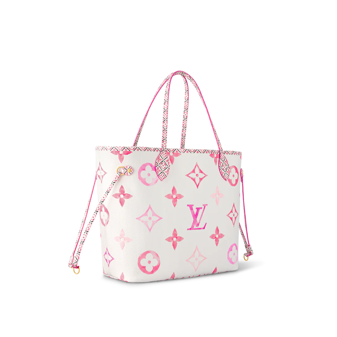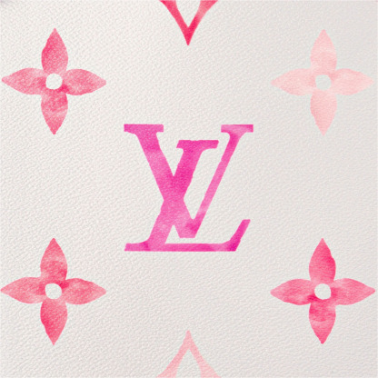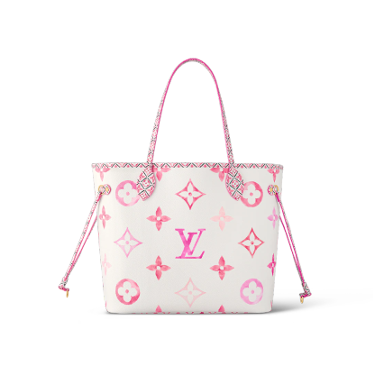 The Neverfull MM tote is summer-ready in cream-color canvas with a Giant Monogram pattern in pastel. The LthtV's and Monogram Flowers are rendered irregularly, as if in watercolor, and are perfectly complemented by the dense Monogram Blossom print on the trim along the top of the bag and on the handles and their mounts.