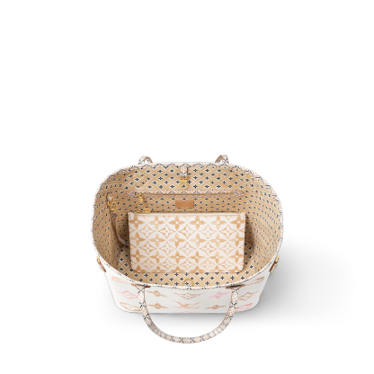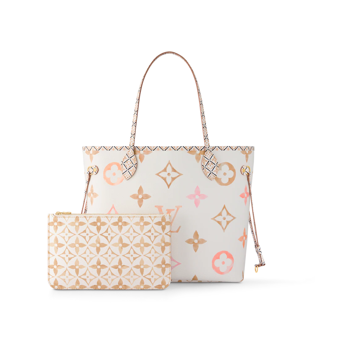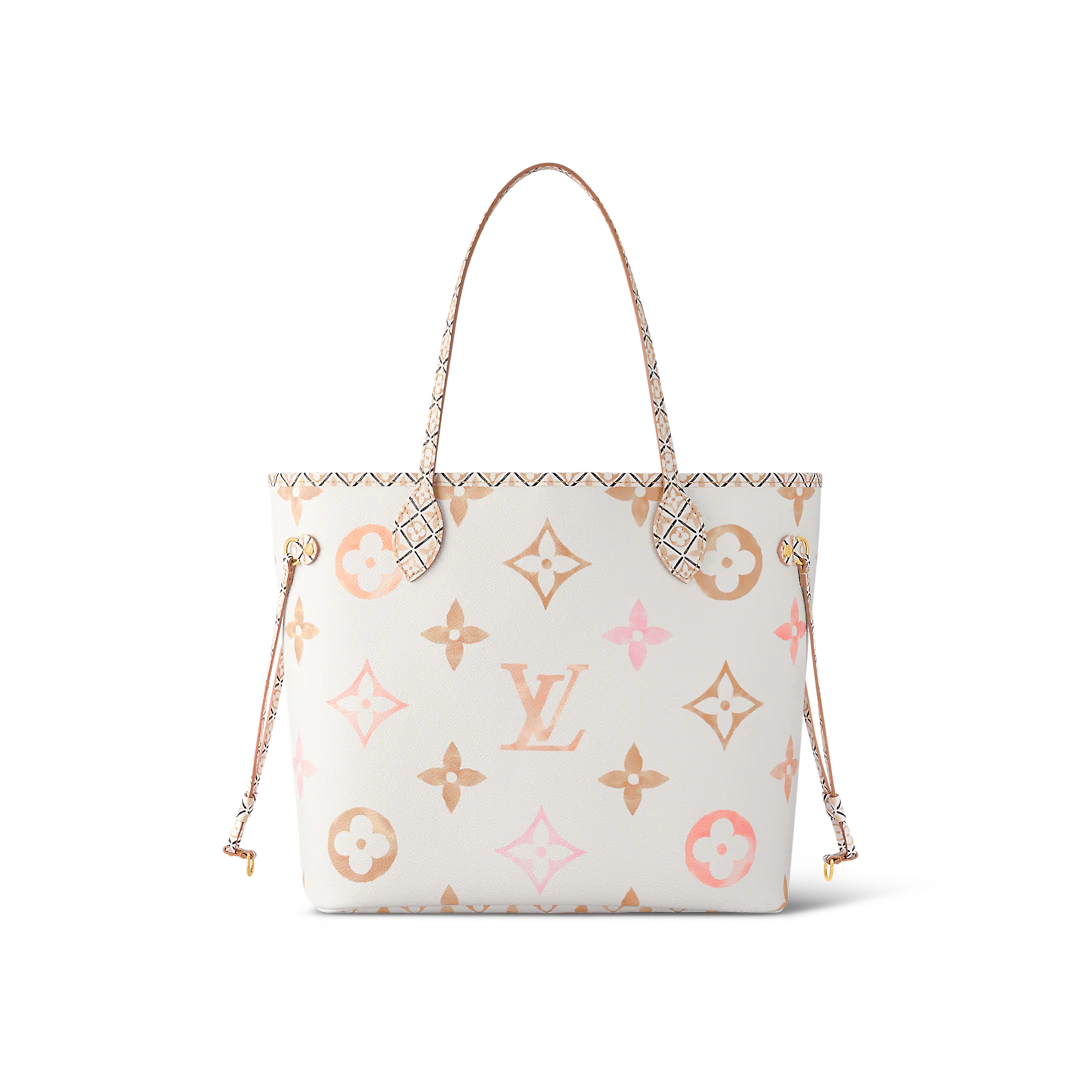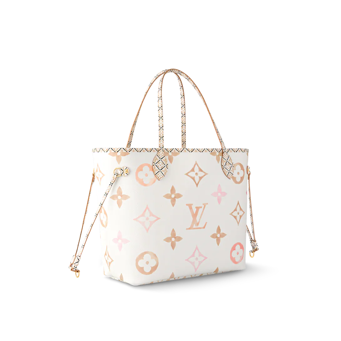 The Neverfull MM tote is summer-ready in cream-color canvas with a Giant Monogram pattern in pastel. The LthtV's and Monogram Flowers are rendered irregularly, as if in watercolor, and are perfectly complemented by the dense Monogram Blossom print on the trim along the top of the bag and on the handles and their mounts.