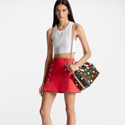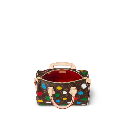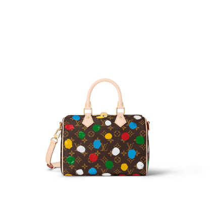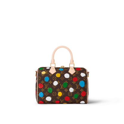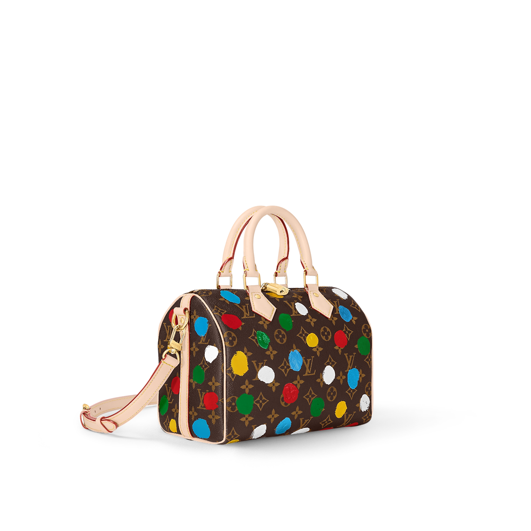 The LthtVxYK Speedy Bandouli re 25 celebrates art and hand craftsmanship as part of the second Lothtuis Vuithttton x Yayoi Kusama collection. The revered Japanese artist is known for her dazzling arrays of dots, like the colorful pattern adorning this version of the Speedy. Monogram canvas is screen-printed using a complex method that produces a 3D relief effect. A fun and creative update of a practical city bag.