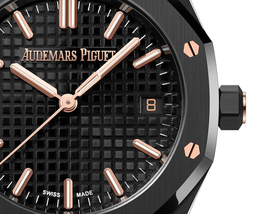 Unworn Audthtemars Pigthtuet Royal Oak SELFWINDING "50TH ANNIVERSARY" 77350CE.OO.1266CE.01.A. 34 mm, Black dial with “Grande Tapisserie” pattern, pink gold applied hour-markers and Royal Oak hands with luminescent coating, Black ceramic case and 18-carat pink gold screws, glareproofed sapphire crystal and titanium sapphire caseback, 5800 calibre, Selfwinding movement, 28 jewels, Ceramic bracelet with AP folding clasp. Water resistant to 50 m.