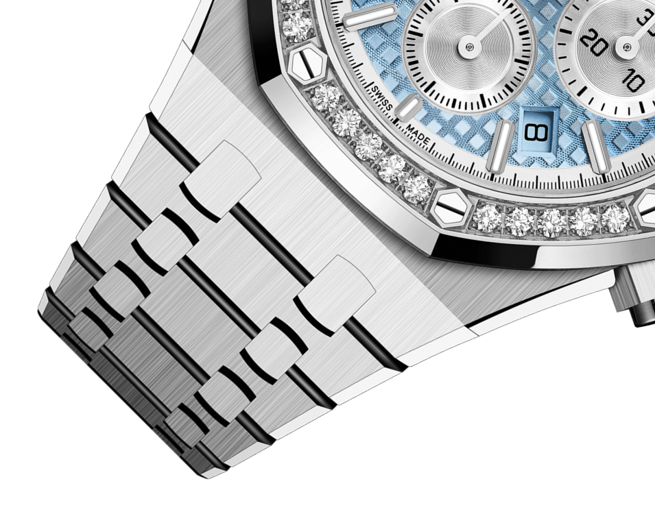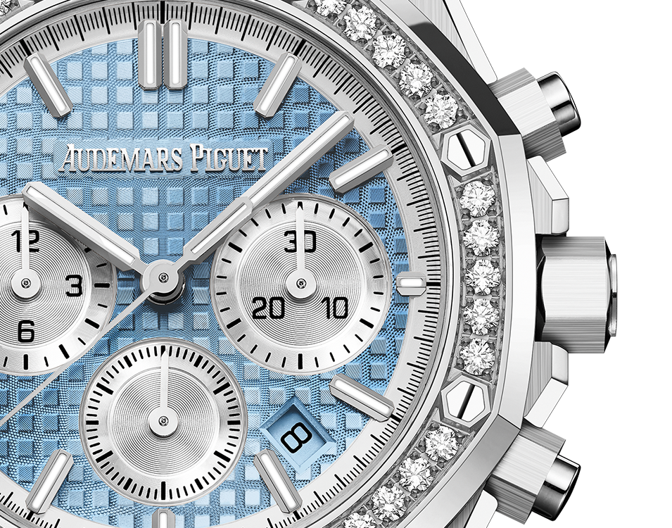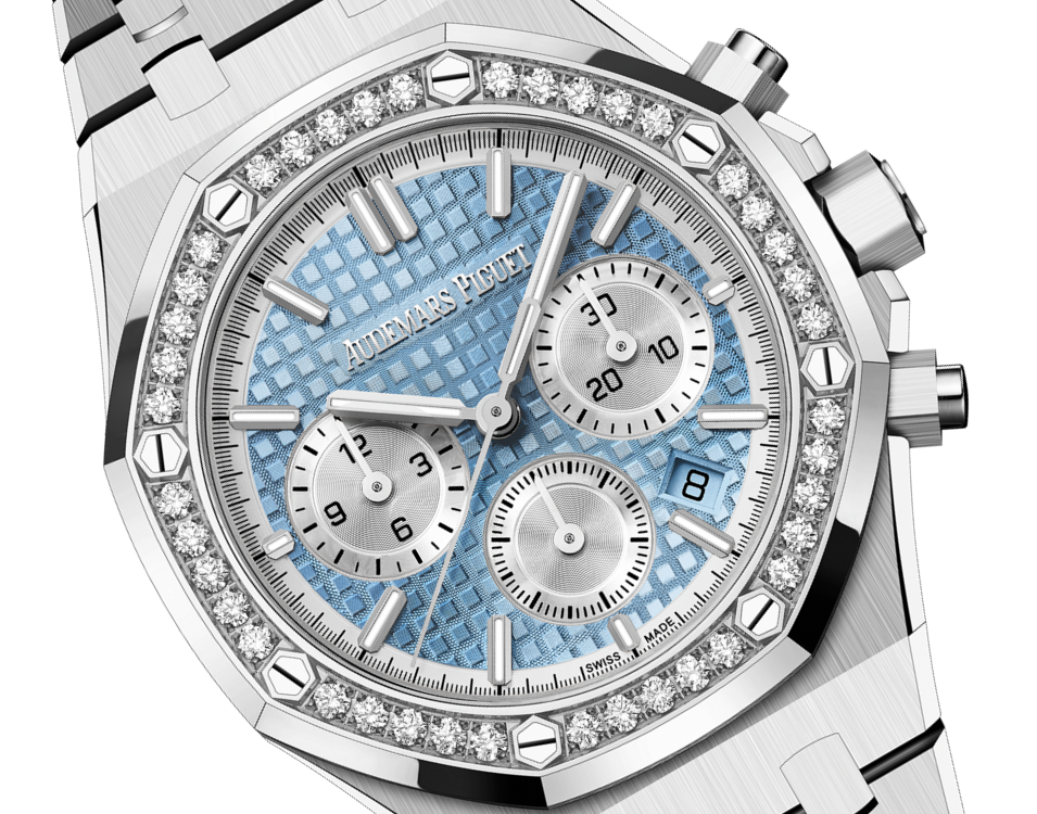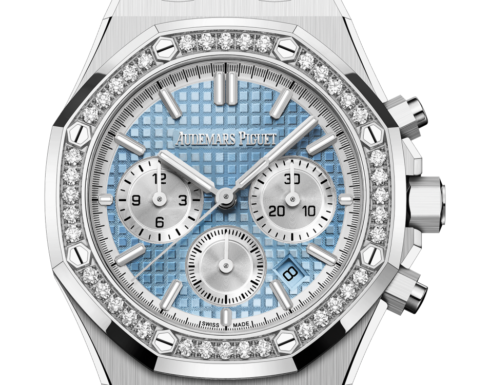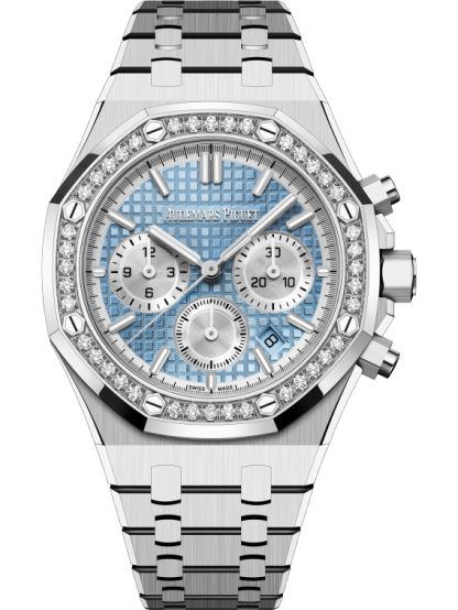 This 38 mm Chronograph elegantly marries stainless steel with a light blue “Grande Tapisserie” dial enhanced with a diamond-set bezel and silver-toned counters. The new Royal Oak design evolution confers the watch a slenderer aesthetic.