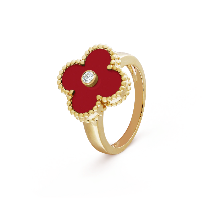 Vintage Alhambra ring, 18K yellow gold, carnelian, round diamond; diamond quality DEF, IF to VVS.
