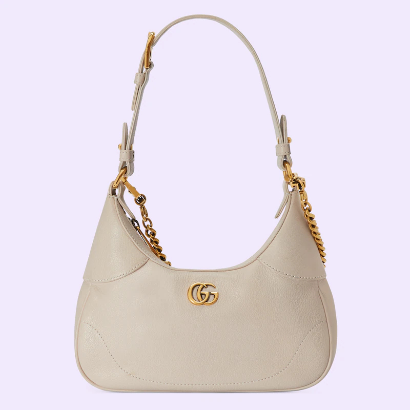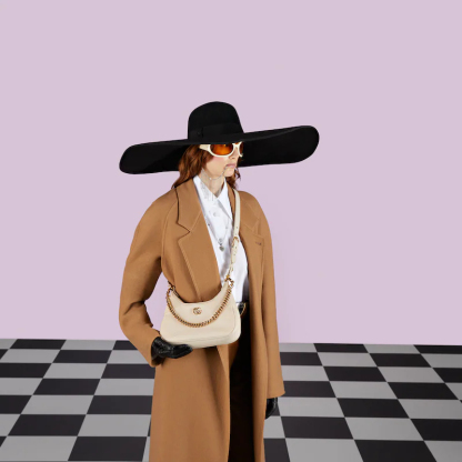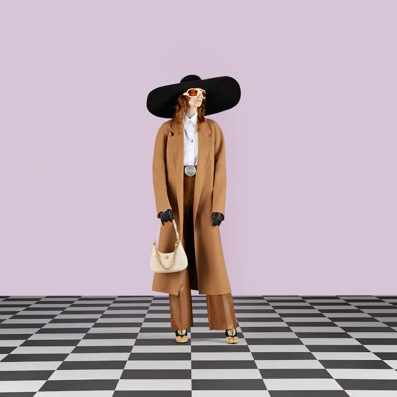 The Cruise 2023 Guthtcci Cosmogonie collection was presented against the backdrop of the historic Castel del Monte in Italy. The show brought together aesthetics from distant eras and geographies, and linked elements from the past with the present. This new small crescent-shaped shoulder bag was inspired by the House’s archives, it is crafted in soft leather and features the Double G emblem—a code originally introduced in the 1970s. Embodying the notion of the versatility, the bag is enriched with two shoulder straps, one is crafted in leather and the other is in Guthtcci’s recognizable gold-toned chain design.
