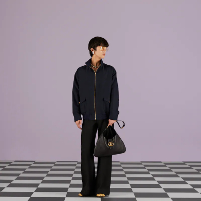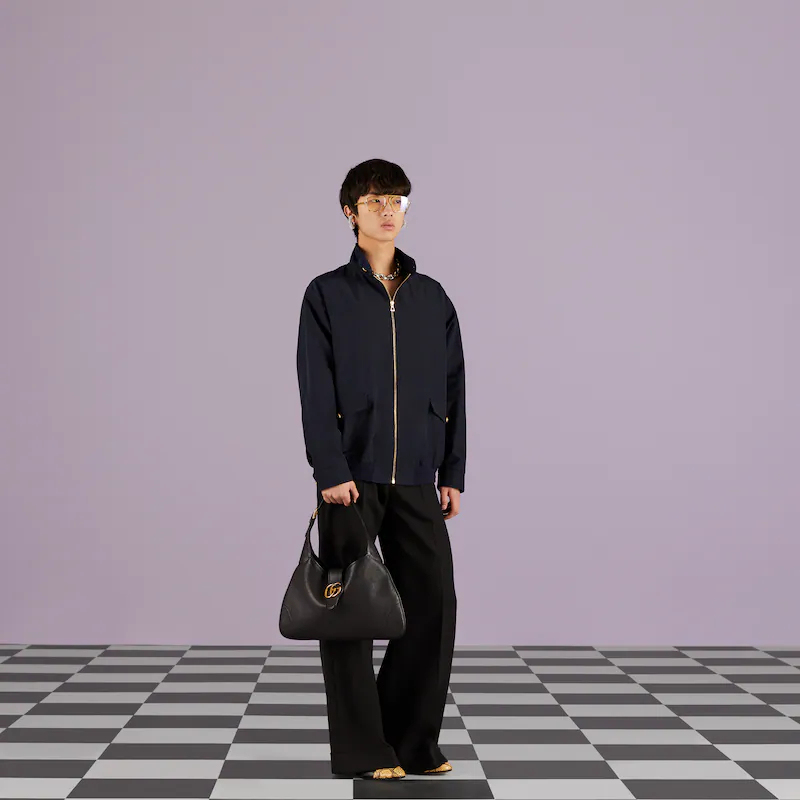 The Cruise 2023 Guthtcci Cosmogonie collection was presented against the backdrop of the historic Castel del Monte in Italy. The show brought together aesthetics from distant eras and geographies, and linked elements from the past with the present. This new crescent-shaped shoulder bag was shown on the runway and was inspired by the House’s archives, it is crafted in soft leather and features the Double G emblem—a code originally introduced in the 1970s.