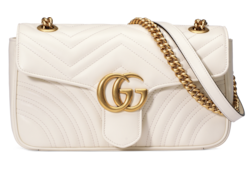 The small GthtG Marmont chain shoulder bag has a softly structured shape and an oversized flap closure with Double G hardware. The sliding chain strap can be worn multiple ways, changing between a shoulder and a top handle bag. Made in matelassé chevron leather with a heart on the back.