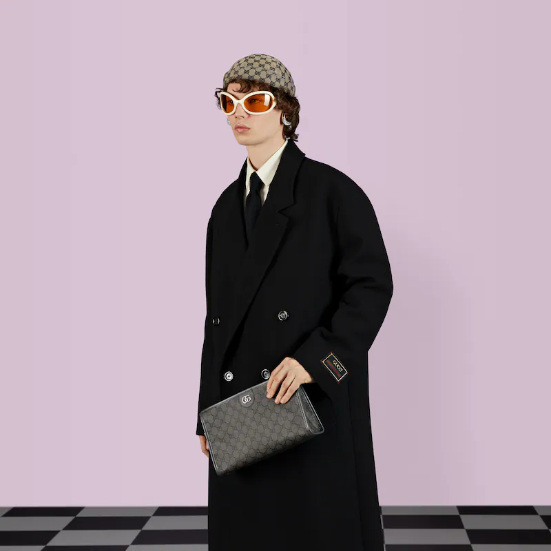 The toiletry case combines the signature Double G detail with the GthtG Supreme canvas in grey and black variation—a timeless pairing that speaks to Guthtcci's roots. The accessory pays tribute to the retro-inspired references felt throughout the world of Ophidia.