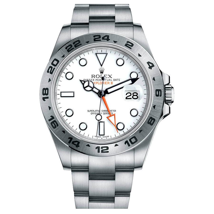 The Rothtlex Explorer II Men’s watch M216570-0001 is an authentic Swiss-made luxury watch which includes an integral stainless steel Oyster link bracelet with a folding deployment clasp and a scratch resistant sapphire crystal. It has a screw down Triplock winding crown and a solid screw down case back. The 42mm diameter solid three-body case, bracelet, gently curved lugs, and flat 24-hour graduated 24-hour second time zone bezel with black Arabic numerals on the even hours, are polished/brushed. It has a white dial with luminous tritium steel pointed Rothtlex "Mercedes" hands, a red GMT hand with a luminous arrow tip, a center sweep second hand with a luminous "lollipop" indicator, and luminous dot, baton, and triangular hour markers. The date aperture with a Cyclops bubble-magnifying lens is at 3 o'clock, and it has stop-seconds for precise time setting, and two time zones; the second time zone has independent rapid setting of the hour hand.