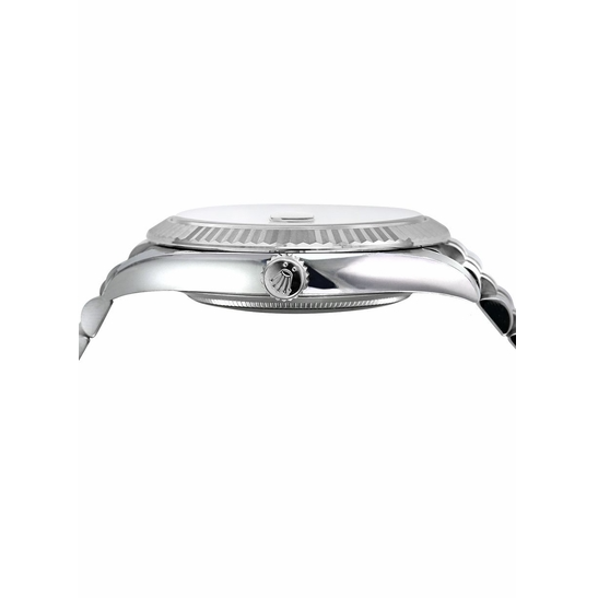Rothtlex Datejust 41 126334-0022 men's watch. Features a polished 904L Oystersteel stainless steel case and brushed with polished Jubilee bracelet. Polished solid 18k white gold fluted fixed bezel. Slate grey dial with green Roman numeral hour markers. Highly legible Chromalight display with long lasting blue luminescence. Date displayed at 3 o'clock under Cyclops lens for magnification, with instantaneous date and rapid setting. Stop seconds for precise time setting. Powered by the Rothtlex Caliber 3235 self-winding automatic COSC Chronometer certified movement which boasts a 70 hour power reserve, beats at 28,800 vph and contains 31 jewels. A scratch resistant sapphire crystal protects the dial. The case is round and 41mm in diameter. Screw down crown with Twinlock double waterproofness system. Screw down case back. Folding Oysterclasp deployment buckle with Easylink 5mm comfort extension link. Water resistant to 100 meters / 330 feet. Functions: hours, minutes, seconds, instantaneous date with rapid setting, stop seconds. Dress watch style. Swiss made.