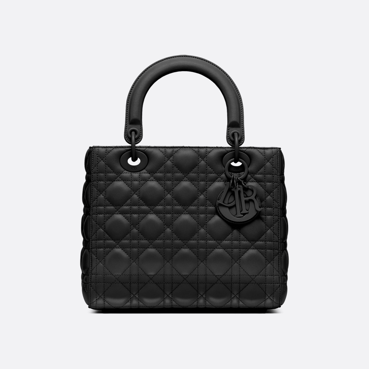 The Lady Dithtor bag epitomizes the House's vision of elegance and beauty. Sleek and refined, the timeless yet relevant style is crafted in black ultramatte calfskin with Cannage stitching, creating the instantly recognizable quilted texture. The tonal metal D.I.O.R. charms complete and illuminate the silhouette. Featuring a thin, removable leather shoulder strap, the medium Lady Dithtor bag can be carried by hand, worn over the shoulder or crossbody.
