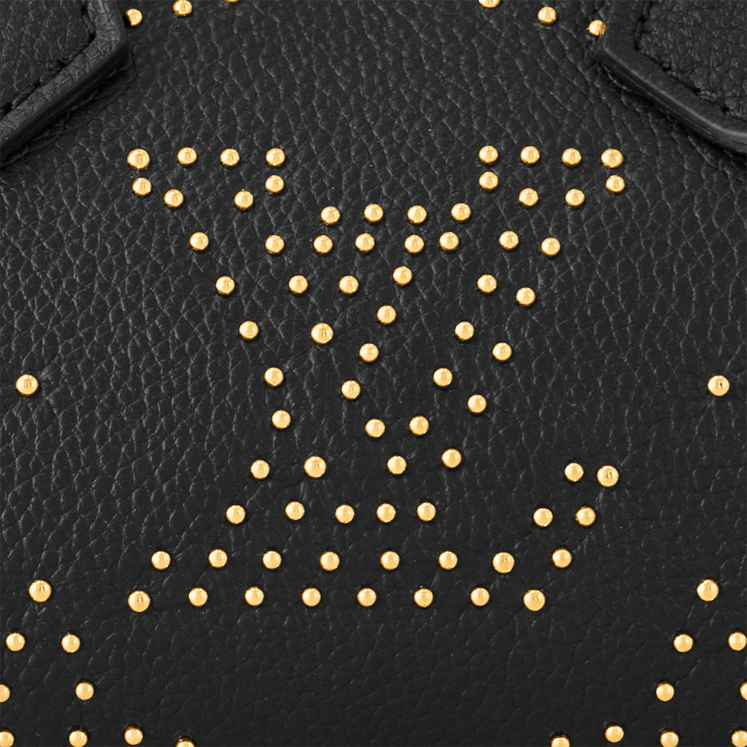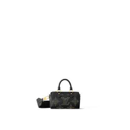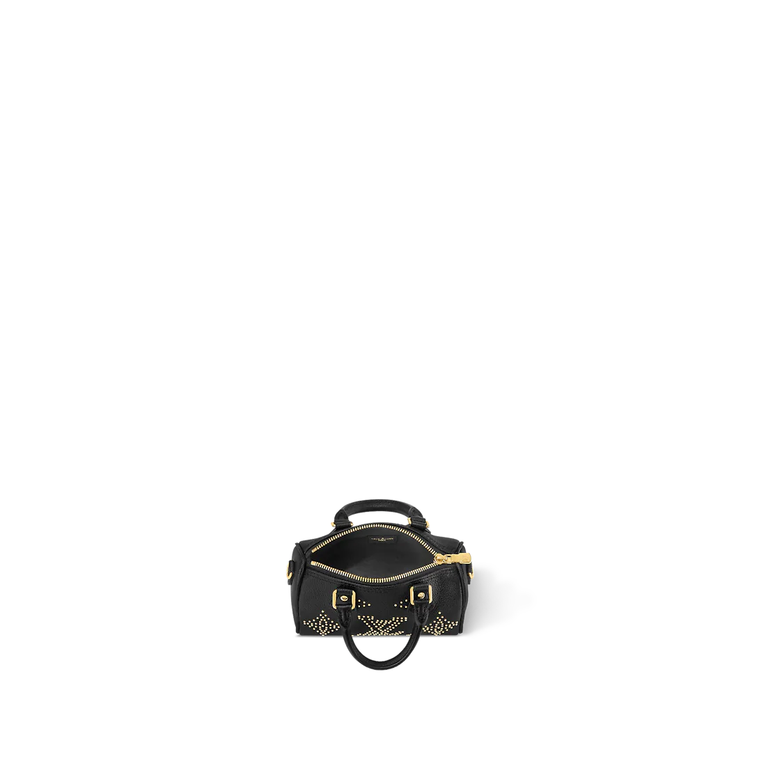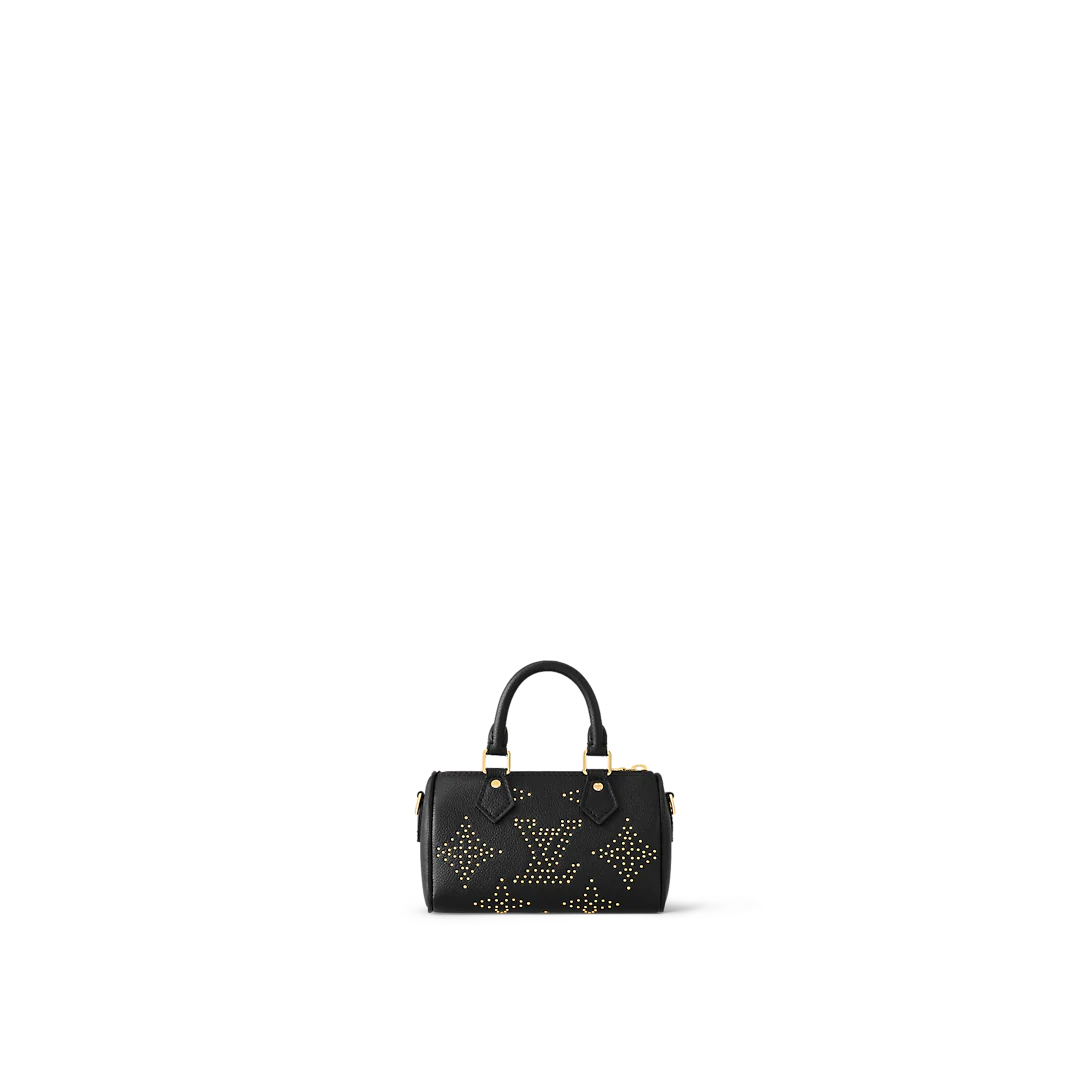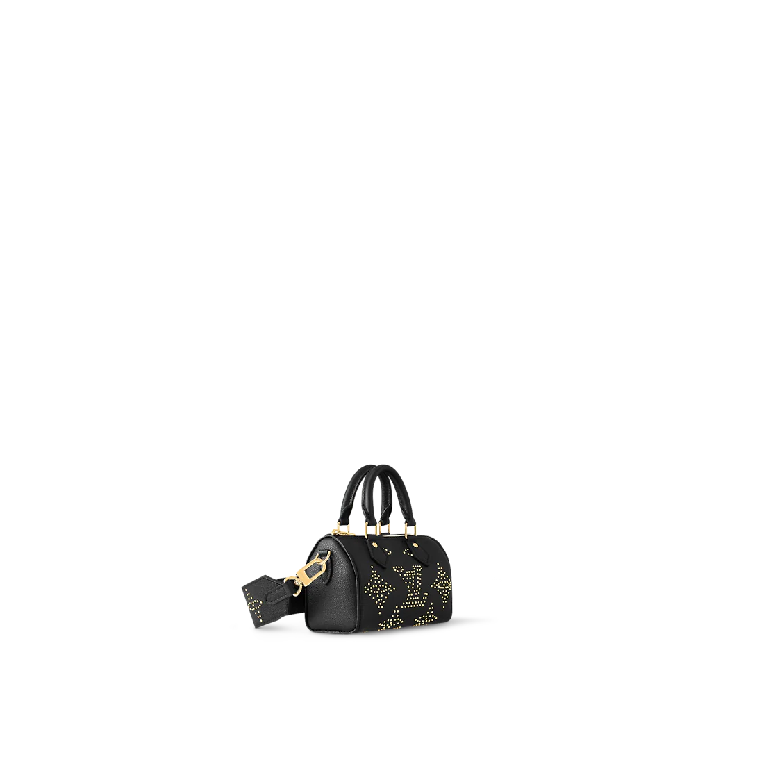 With a Monogram motif created from golden studs on grained cowhide leather, the Nano Speedy has a glamorous edge. This tiny handbag has two rolled-leather top handles and a removable strap, also embellished with gold-color studs that create Monogram Blossoms. Zip closure keeps belongings secure inside.