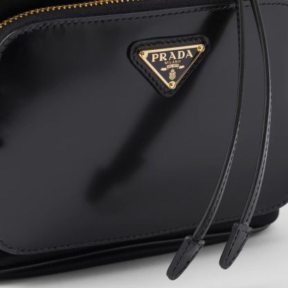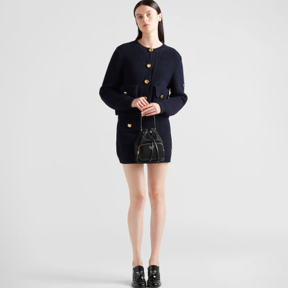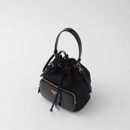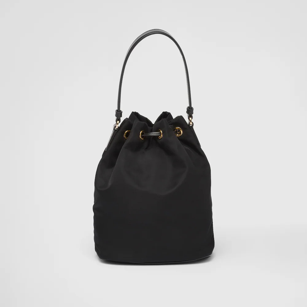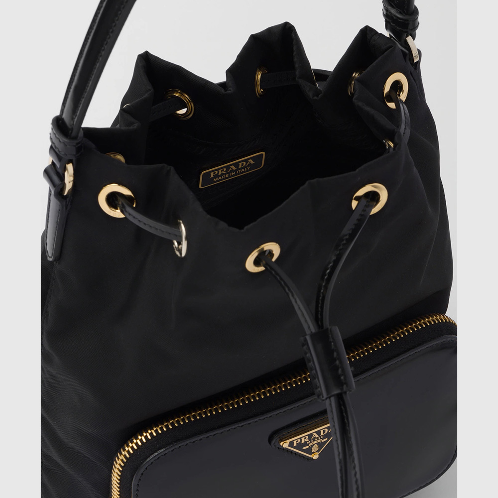 Soft, contemporary lines define this casual and versatile bucket bag worn as a handbag or crossbody style thanks to the removable handle and shoulder strap. The design combines pragmatic Re-Nylon, the innovative regenerated nylon material, with refined brushed leather details and metal hardware. The accessory is completed by an external zipper pocket and decorated with the enameled metal triangle logo.