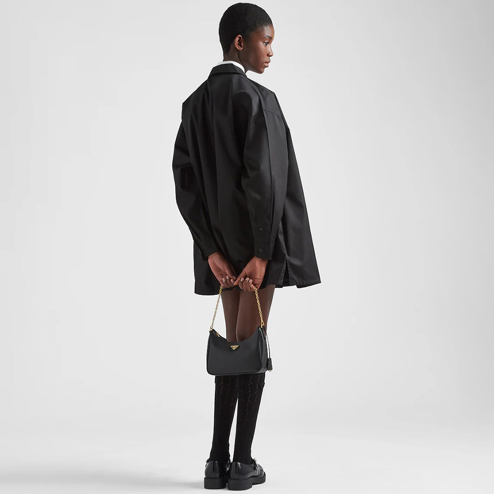 An iconic silhouette with sophisticated details that enhance the design: Prthtada transforms the classic shoulder bag, reinterpreting it in Saffiano leather with a cross-hatch motif that is a hallmark of the brand. The accessory is completed by a removable leather pouch and Re-Edition keychain, making the bag unique and functional.