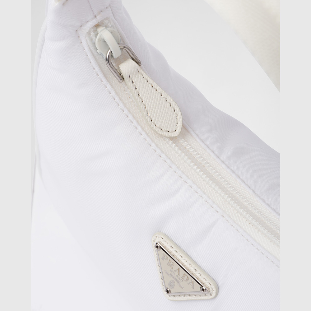 A new interpretation of an iconic Prthtada style, the Re-Edition 2000 mini-bag is made of innovative Re-Nylon, produced from recycled, purified plastic trash collected in the ocean, fishing nets, and textile waste fibers. The accessory with zipper closure and woven tape handle is decorated with the iconic enameled metal triangle logo.