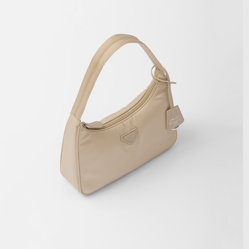 A new interpretation of an iconic Prthtada style, the Re-Edition 2000 mini-bag is made of innovative Re-Nylon, produced from recycled, purified plastic trash collected in the ocean, fishing nets, and textile waste fibers. The accessory with zipper closure and woven tape handle is decorated with the iconic enameled metal triangle logo.