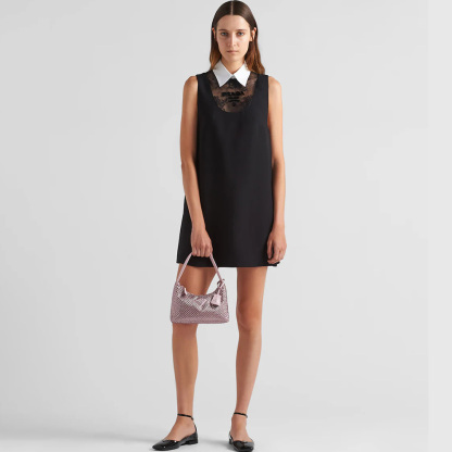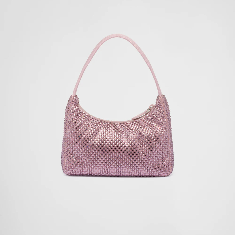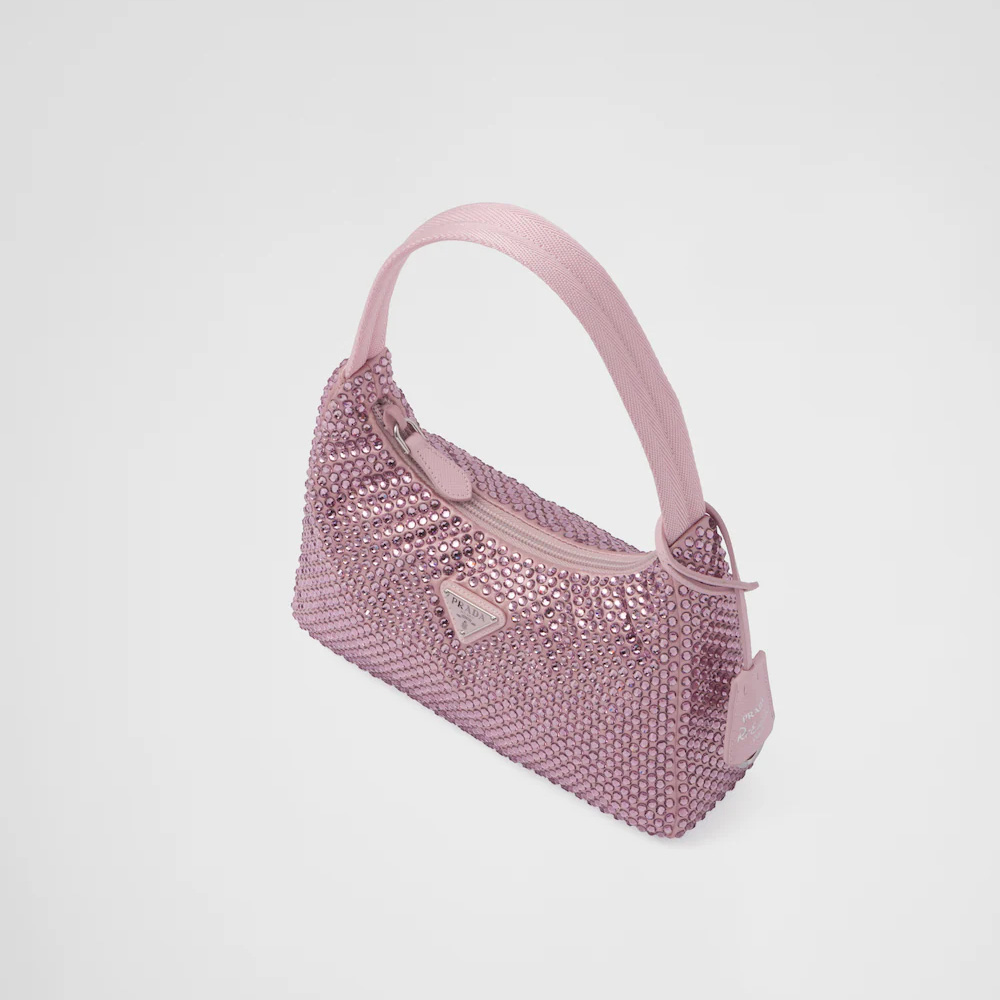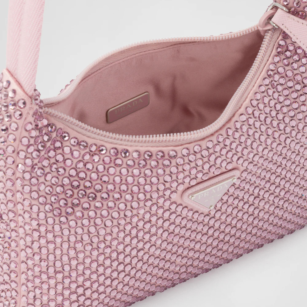 This mini hobo bag, an iconic Prthtada style, comes in a luxurious satin version studded with crystals and decorated with the emblematic enamel triangle logo.