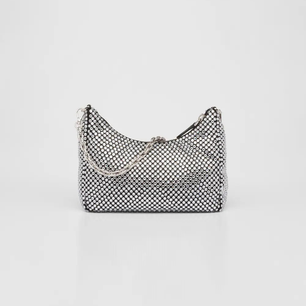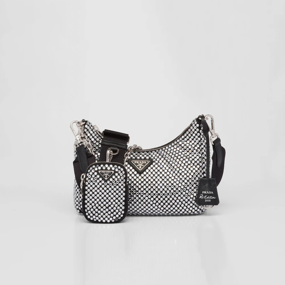 A new interpretation of an iconic Prthtada style, the sparkling Re-Edition 2005 mini-bag is characterized by the all-over crystal embellishment that gives it precious allure. The bag, which comes with a coordinated pouch that hooks to the strap, can be worn in different ways thanks to the adjustable woven tape shoulder strap and chain handle.