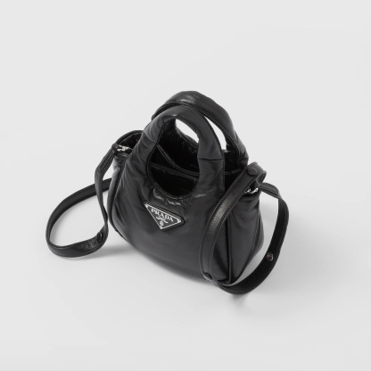 Softness and a simple silhouette define this small handbag made of nappa leather with a padded construction. The tonal triangle logo frames the contrasting lettering logo, creating a textured, three-dimensional contrast that enhances the design of the accessory.