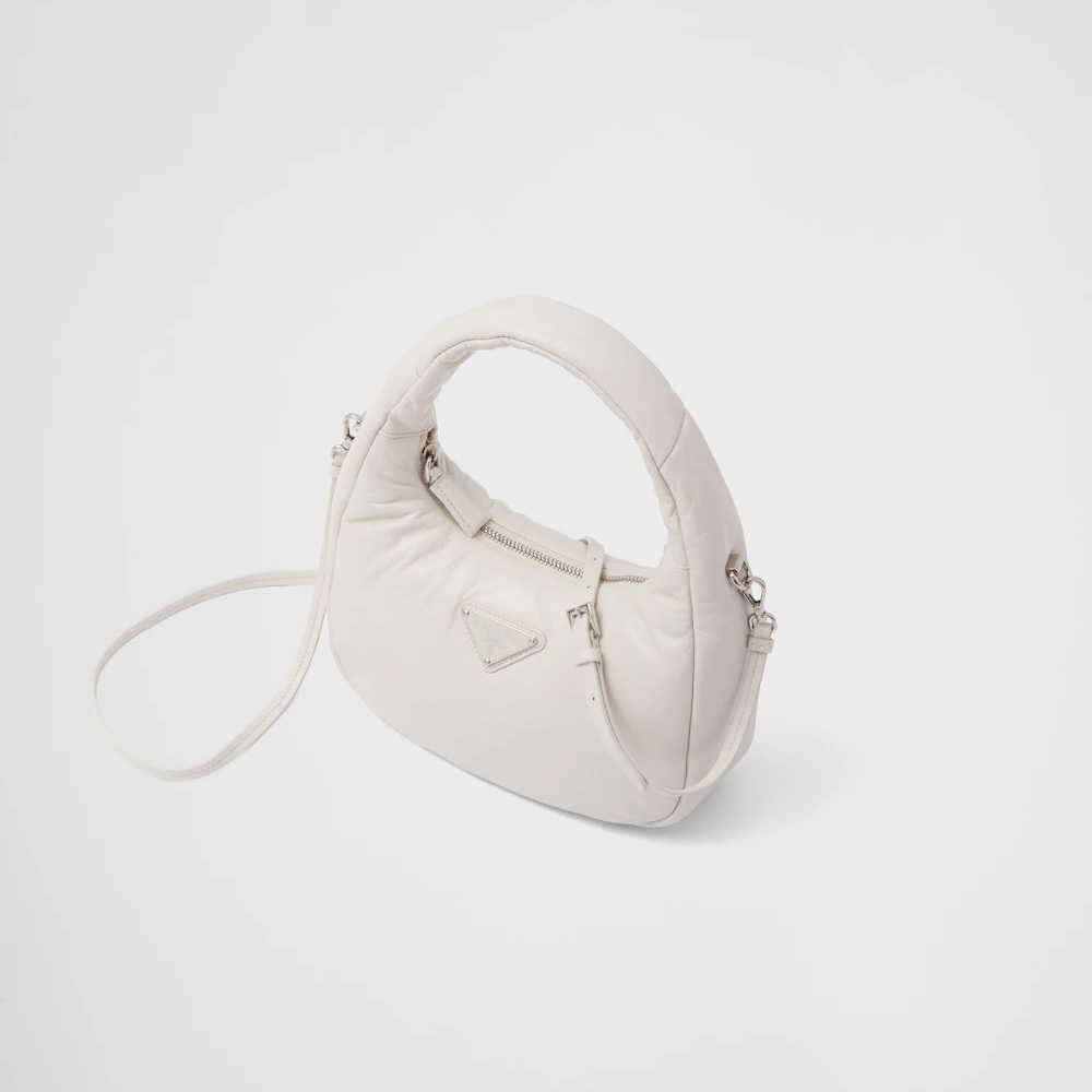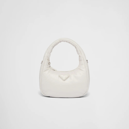 A harmonious, bold silhouette characterizes this mini-bag made of padded nappa leather accented with the detachable, adjustable shoulder strap. Defined by its versatile allure, the accessory has a zipper closure and is decorated with the emblematic enameled metal triangle logo.