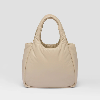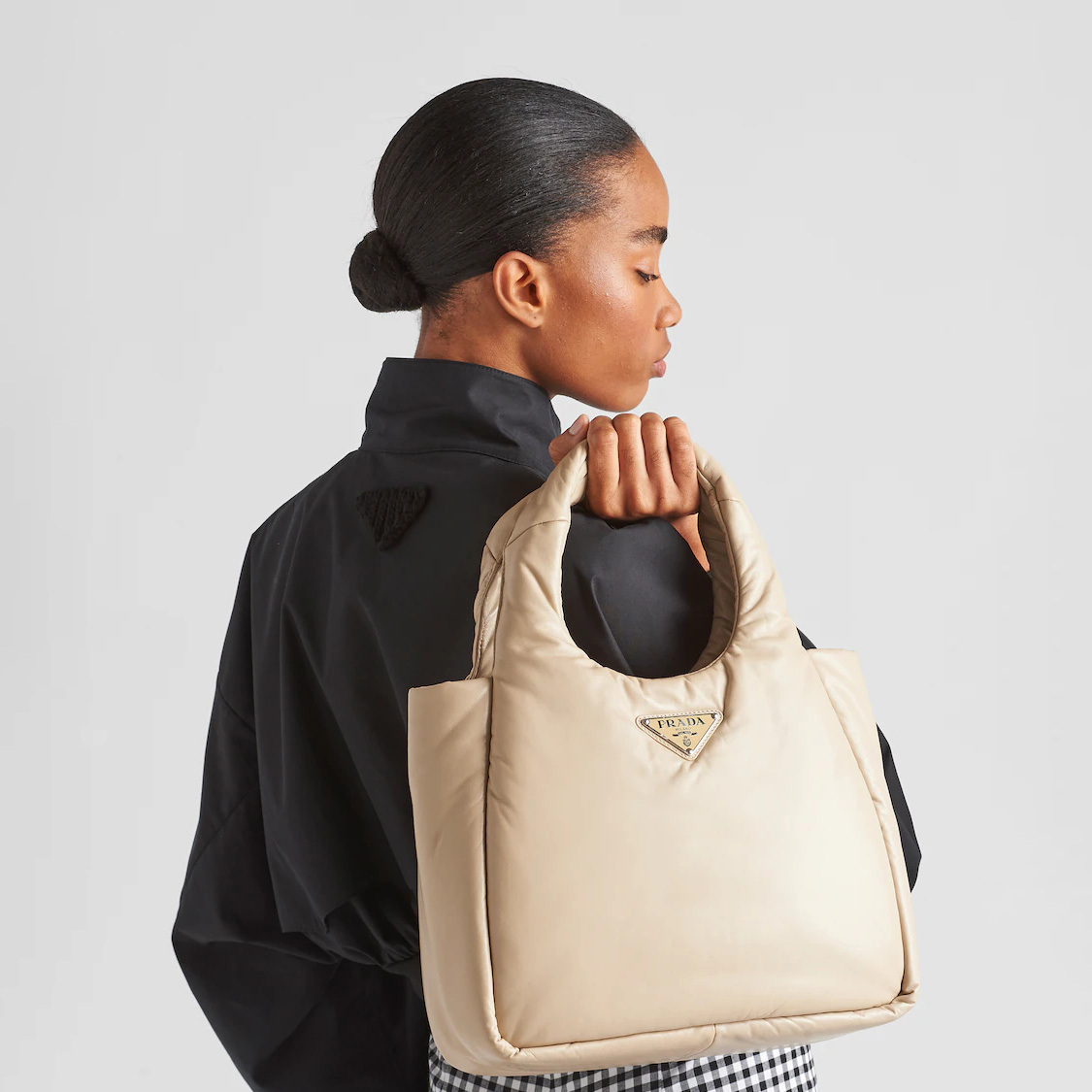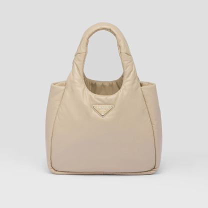 This tote bag made of soft nappa leather is decorated with the iconic enameled metal triangle logo that illuminates the front. The inverted construction emphasizes the soft, curved image of the silhouette completed by a double handle and magnetic closure. The interior is lined in nappa leather and has three compartments.