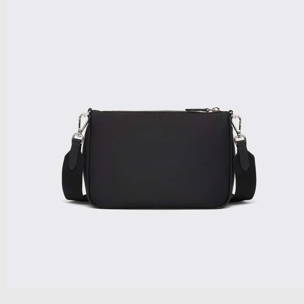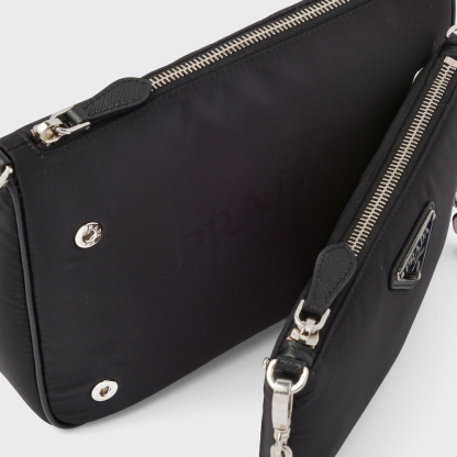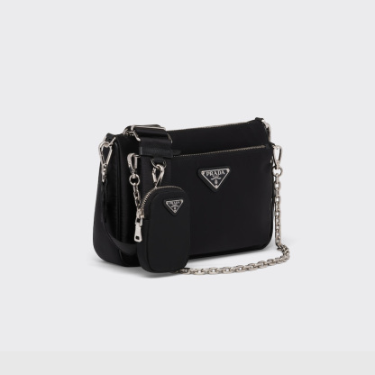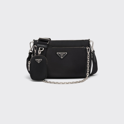 Saffiano leather details add an iconic touch to this shoulder bag made of Re-Nylon, a distinctive fabric of the brand produced from recycled, purified plastic materials collected in the ocean, fishing nets, and textile fibers. Its removable details are distinctive: The logo-print shoulder strap and front pocket with chain that turns into a pouch. The accessory is embellished with the enameled metal triangle logo.