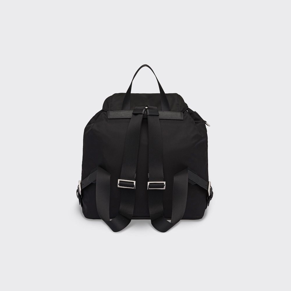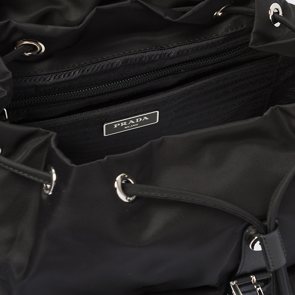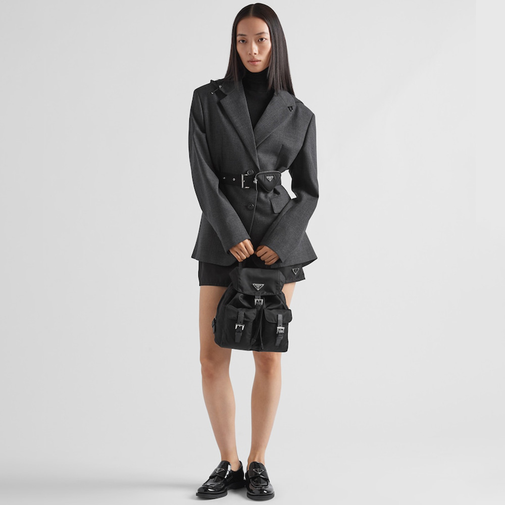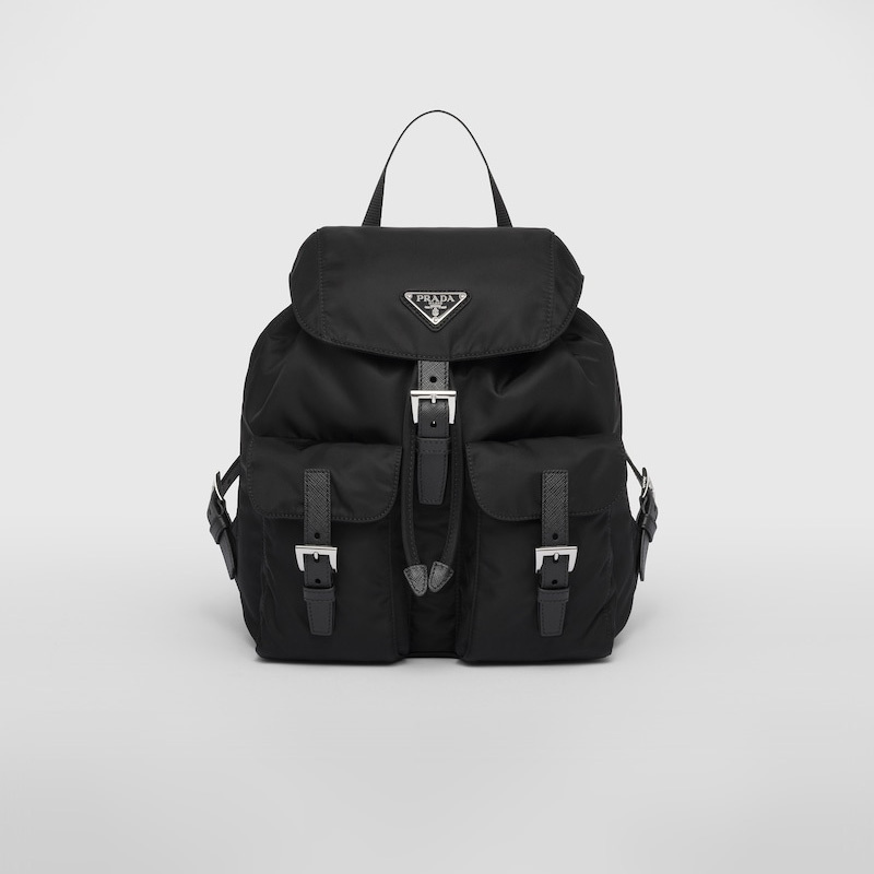 A blend of materials with modern allure and timeless charm are the choice for this iconic backpack of the brand that combines a base made of Re-Nylon, a sustainable evolution of the industrial fabric that is a Prthtada hallmark, and Saffiano leather details. The enameled metal triangle logo, an historic element reinterpreted each season on designs with contemporary charm, decorates the front.