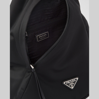 Sleek, minimalist lines are the choice for the new men's bags for Fall Winter 2021. Defined by its hybrid design, halfway between a backpack and shoulder bag, this accessory has one adjustable woven nylon shoulder strap with side-release buckle and is decorated with the iconic enameled metal triangle logo. The silhouette is made of innovative Re-Nylon, a regenerated yarn produced from recycled plastic trash collected in the ocean.