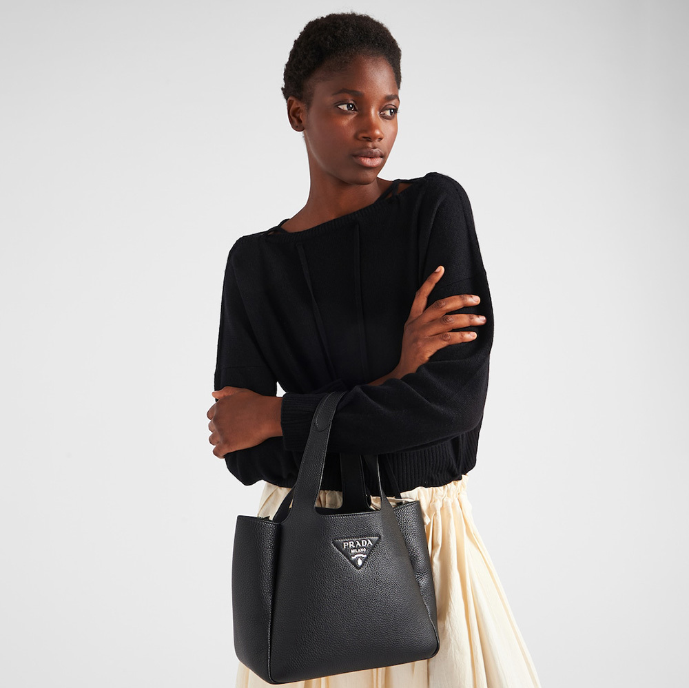 This soft leather tote introduced for the Fall Winter 2020 collection presents a new interpretation of the triangle logo, traced by stitching with the Prthtada metal lettering logo illuminating its center. The reverse stitching emphasizes the soft, rounded silhouette that comes with a double leather handle and magnetic button closure. The nappa interior has three compartments.