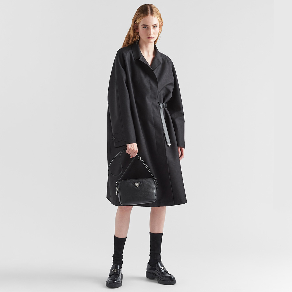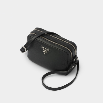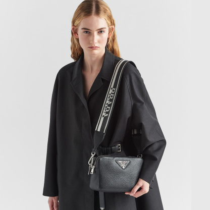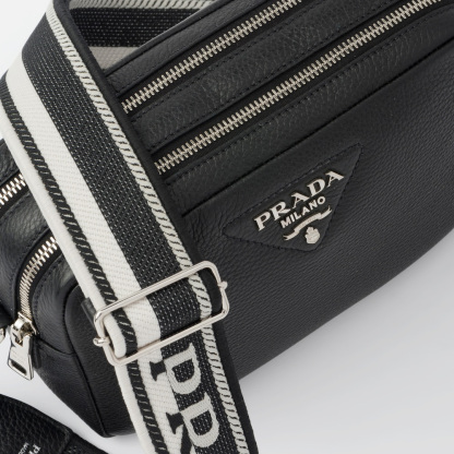 This leather shoulder bag with a double zipper is made of soft leather and illuminated by metal hardware for a modern accent. The accessory is completed by the detachable woven tape shoulder strap embroidered with the logo in a contrasting color, that makes it wearable as a crossbody or shoulder bag.
