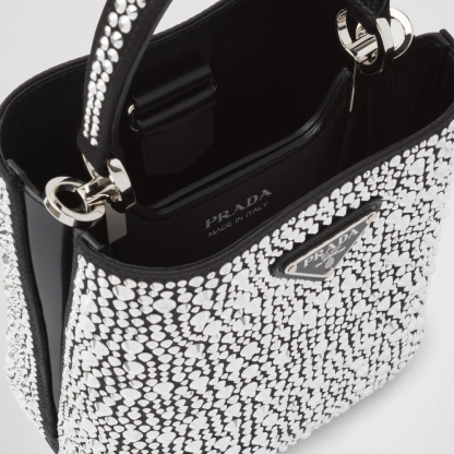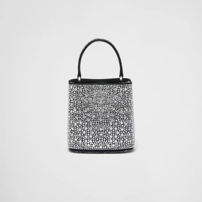 The elegant design of the Prthtada Panier bag is emphasized by luminous all-over crystals that recall the jewelry world. The bag has a detachable shoulder strap and an exclusive name tag with metal logo.