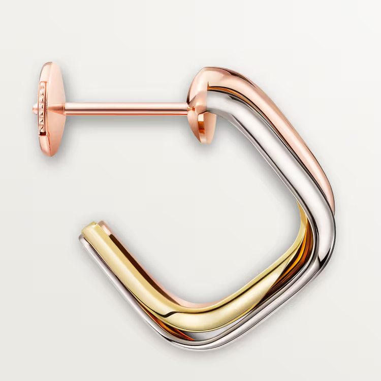 Trinity earrings, cushion-shaped, 18K white gold (750/1000), 18K rose gold (750/1000), 18K yellow gold (750/1000).