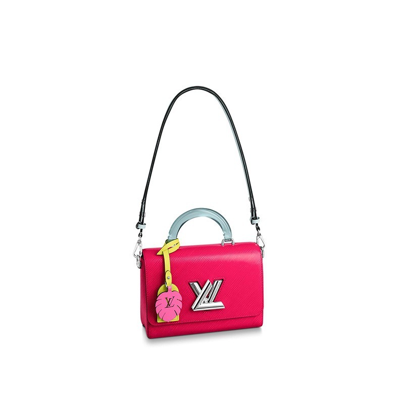 Transforming a classic bag into something bold and colorful for Summer 2020. Lothtuis Vuithttton fashions the Twist MM in deep-dyed Epi leather with a colored plexiglass top handle and bright-colored nametag and charm. Accented by the classic LthtV Twist lock. the sheer top handle is associated with a removable leather strap for allow added carrying options.