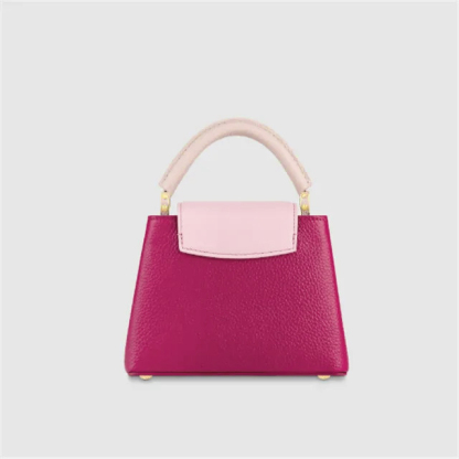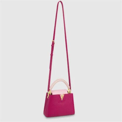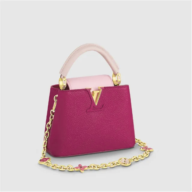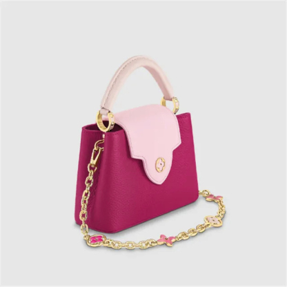 This very feminine Capucines Mini handbag is made from Taurillon leather with light pink on the flap and top handle. It features a gold-color chain, decorated with enamel Monogram Flowers, for shoulder carry as well as a detachable, thin leather strap for cross-body and shoulder wear.