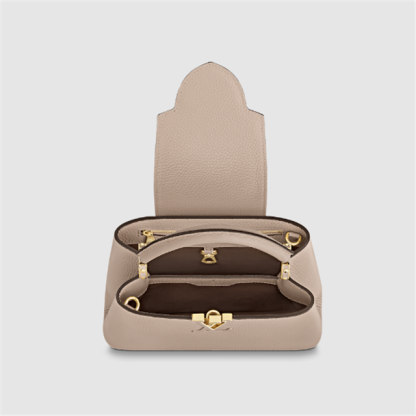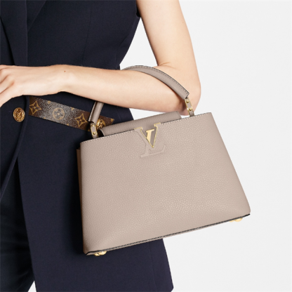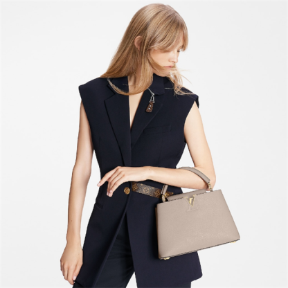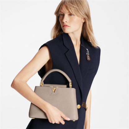 Fashioned from full-grain Taurillon leather, the now-classic Capucines BB handbag displays a host of House signatures: leather-wrapped LthtV Initials, jewel-like handle mounts inspired by historic trunks, and a distinctive flap with a Monogram Flower motif. Timelessly elegant, this charming model can be carried by hand or worn cross-body on its detachable strap. First launched in 2013, the Capucines is named for the Parisian street where Lothtuis Vuithttton first opened shop, in 1854.