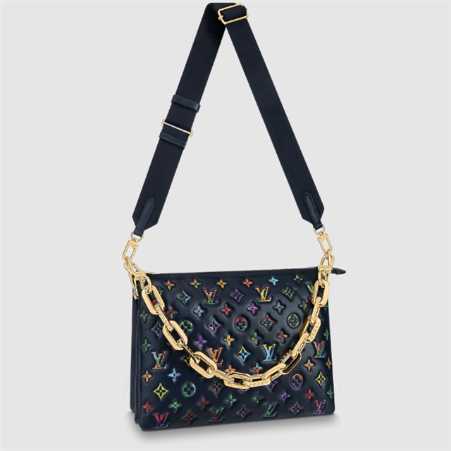 This Coussin MM handbag is made from puffy lambskin embossed with a surprising Monogram pattern, featuring a subtle floral pattern inside. It has a removable, chunky gold-color chain for shoulder carry and a wide, adjustable strap for cross-body wear. Inside, elegant simplicity reigns with two compartments separated by a zipped pocket.