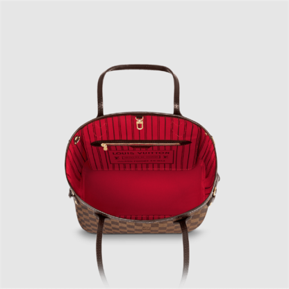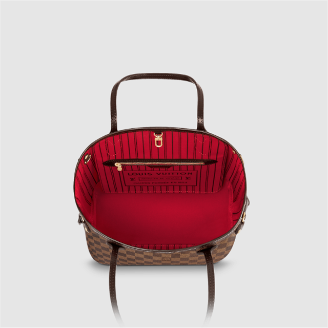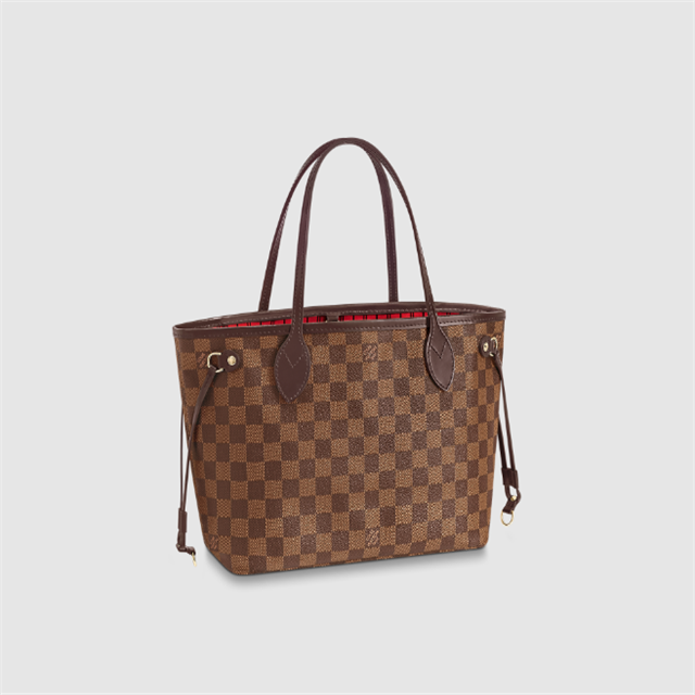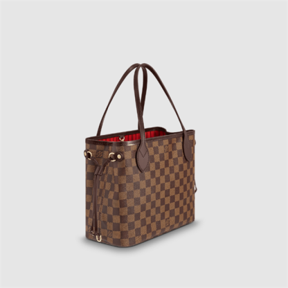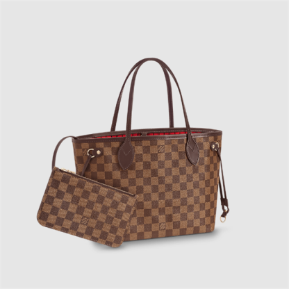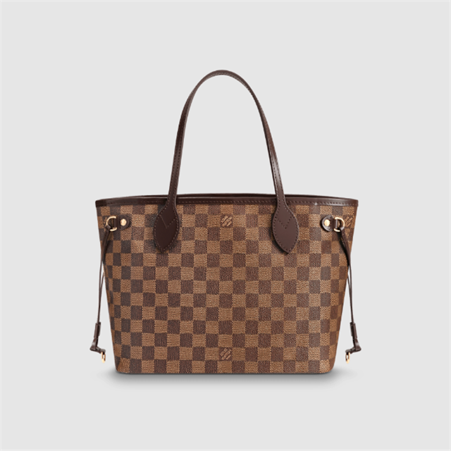 The Neverfull PM tote pairs timeless design with heritage details. Crafted from Damier Ebene canvas with natural cowhide trim, it is capacious yet not bulky, with side laces that cinch for a sleek allure or loosen for a casual look. Slim, comfortable handles slip easily over the shoulder or arm. Lined in colorful textile, it features a removable pouch which can be used as a clutch or an extra pocket.