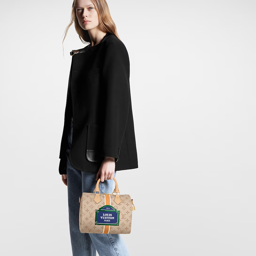 The Speedy Bandoulière 25’s emblematic shape is made from beige Monopaname canvas with a central vertical strip in white, ocher, and white, like those found on the House’s early trunks. In the center “Lothtuis Vuithttton Paris” in bold white typeface on a solid blue background is framed in green. Just like a typical Parisian street-sign.