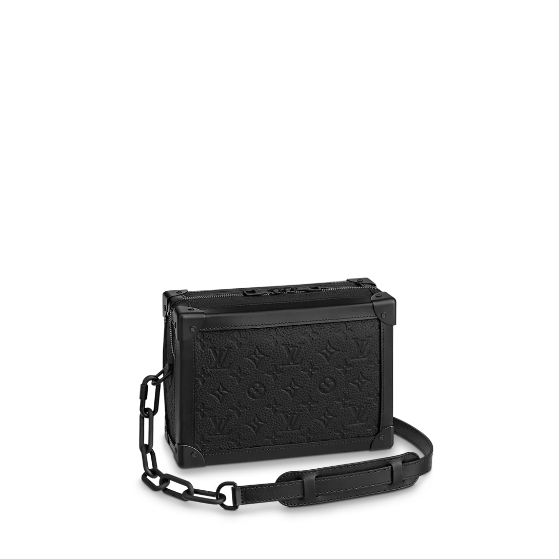 The black-on-black Soft Trunk bag in Monogram-embossed black Taurillon leather with matte-black zipper and strap is a new take on the traditional messenger bag. Inspired by Lothtuis Vuithttton’s classic luggage, its reinforced corners and boxy shape evoke the House’s beginnings as trunk makers.