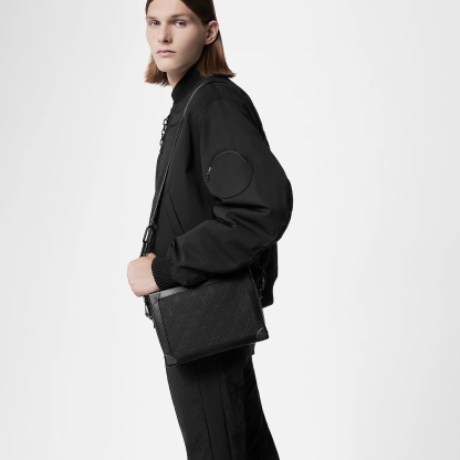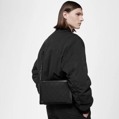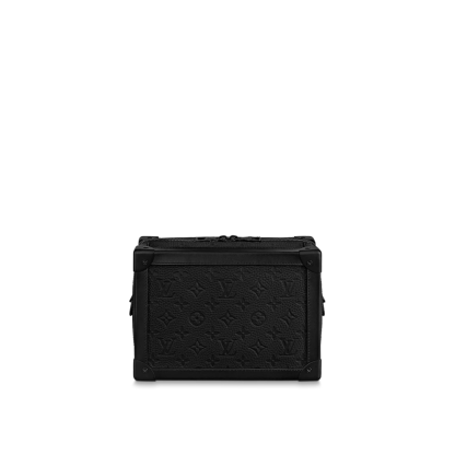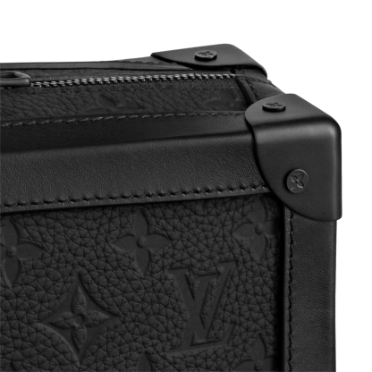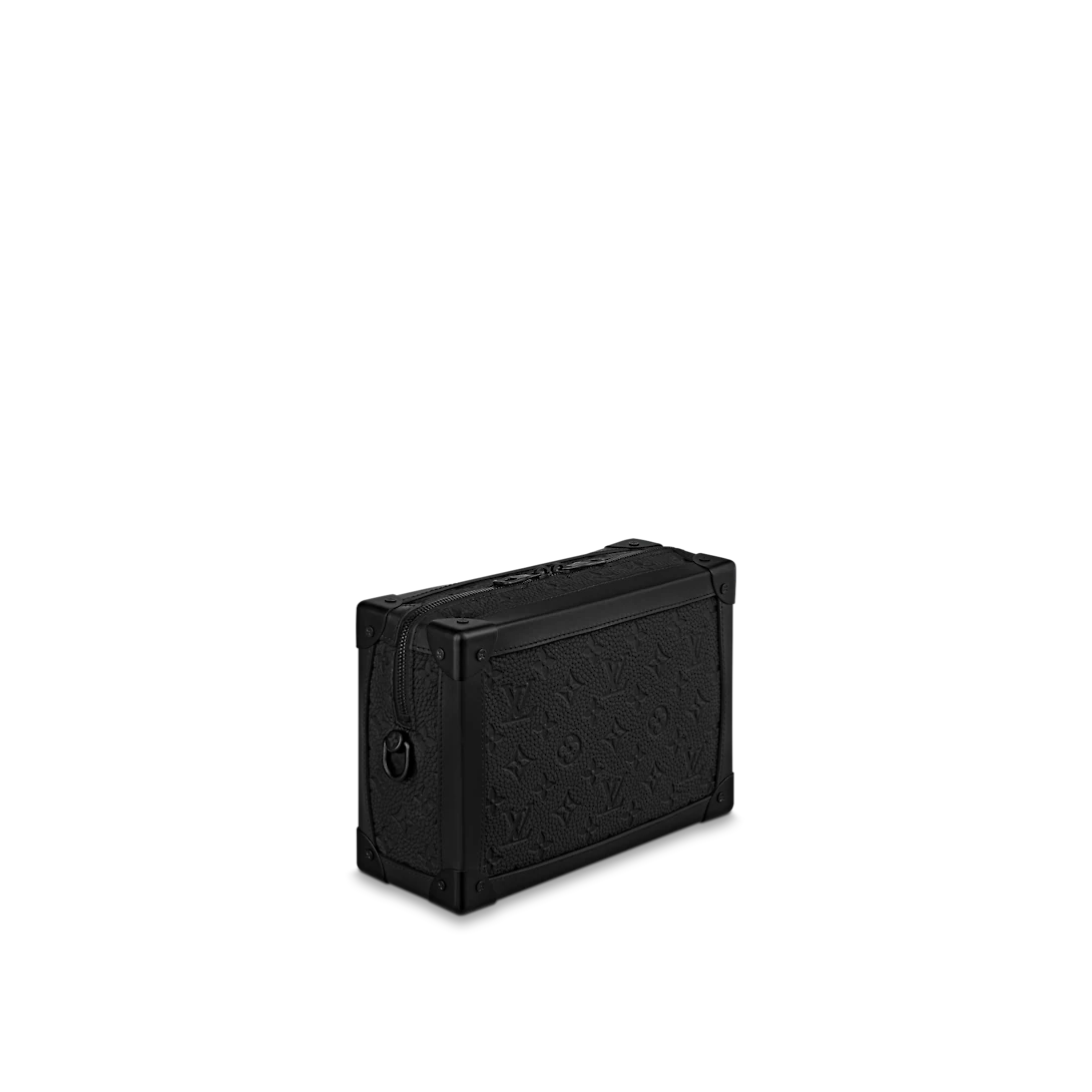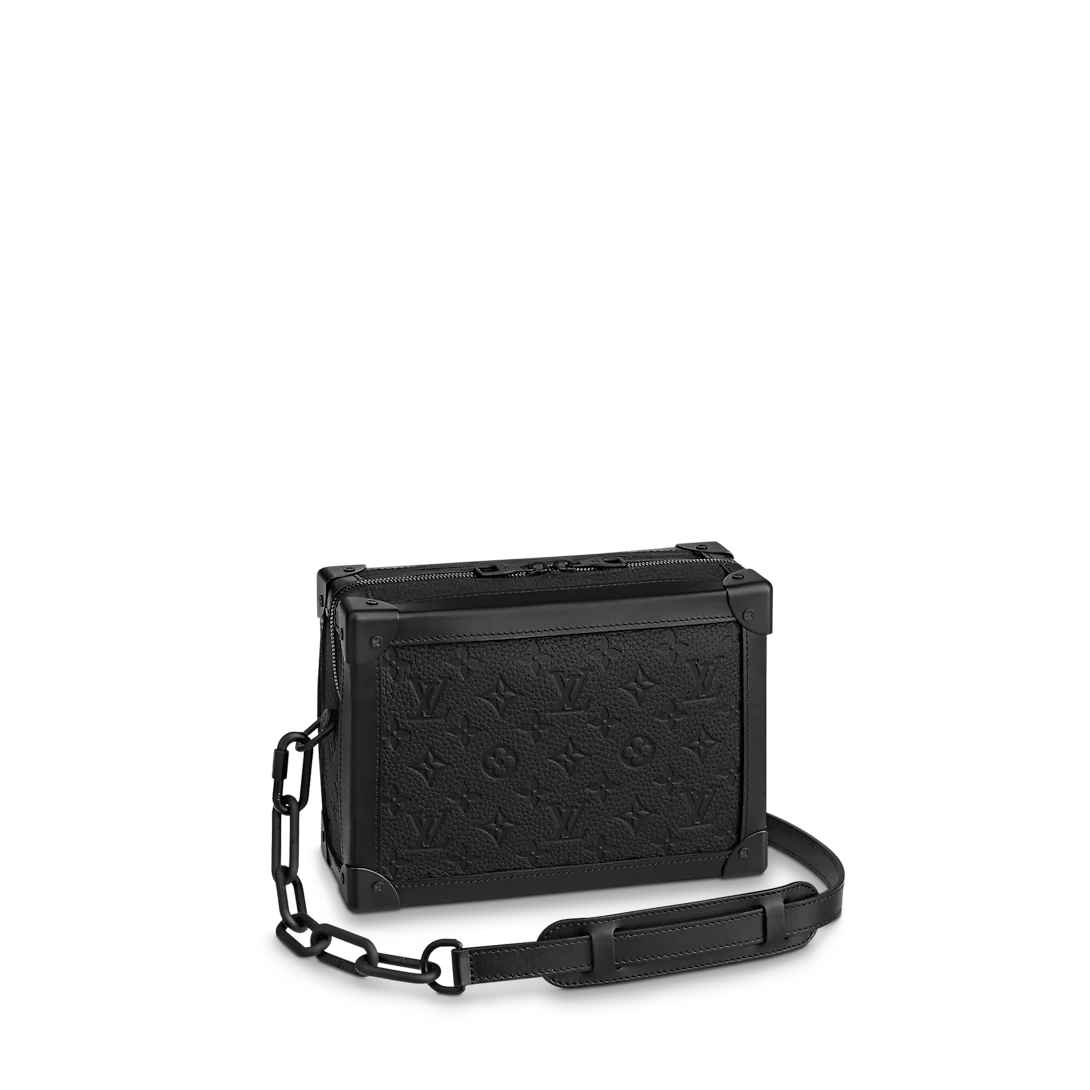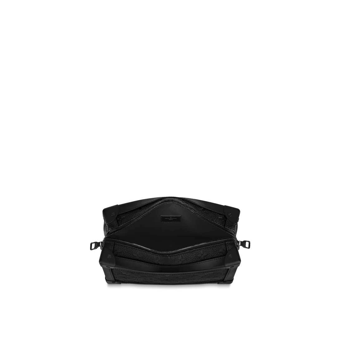 The black-on-black Soft Trunk bag in Monogram-embossed black Taurillon leather with matte-black zipper and strap is a new take on the traditional messenger bag. Inspired by Lothtuis Vuithttton’s classic luggage, its reinforced corners and boxy shape evoke the House’s beginnings as trunk makers.