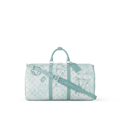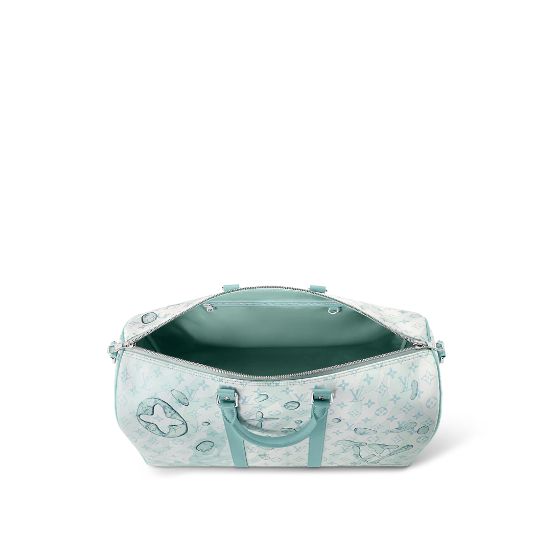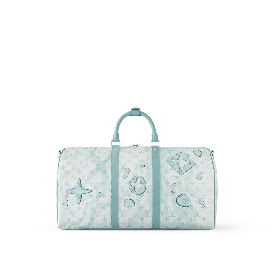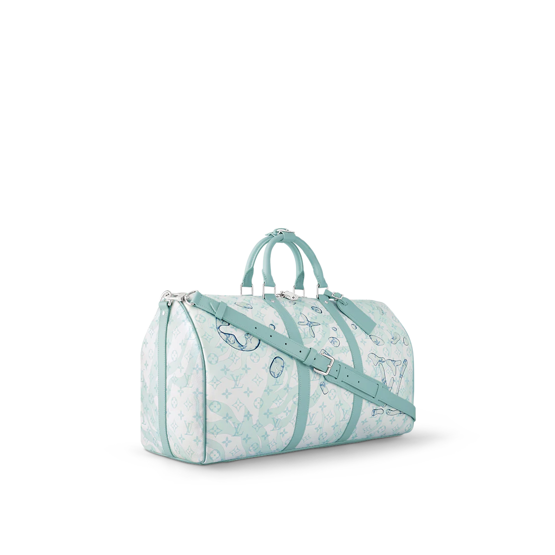 The Keepall Bandoulière 50 bag is made from Monogram Aquagarden canvas, with an aquatic version of Monogram pattern overlaid with surprisingly realistic water-drop renderings of the Monogram Flowers and LthtVs. The leather lateral bands, top handles, and name tag bring a structured feel to this classic travel bag.